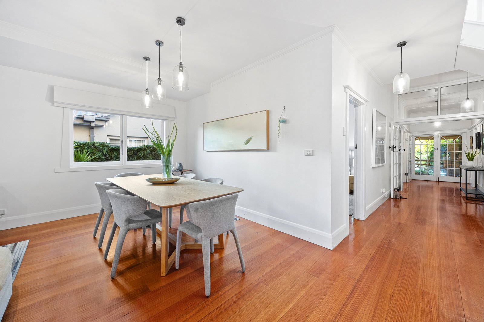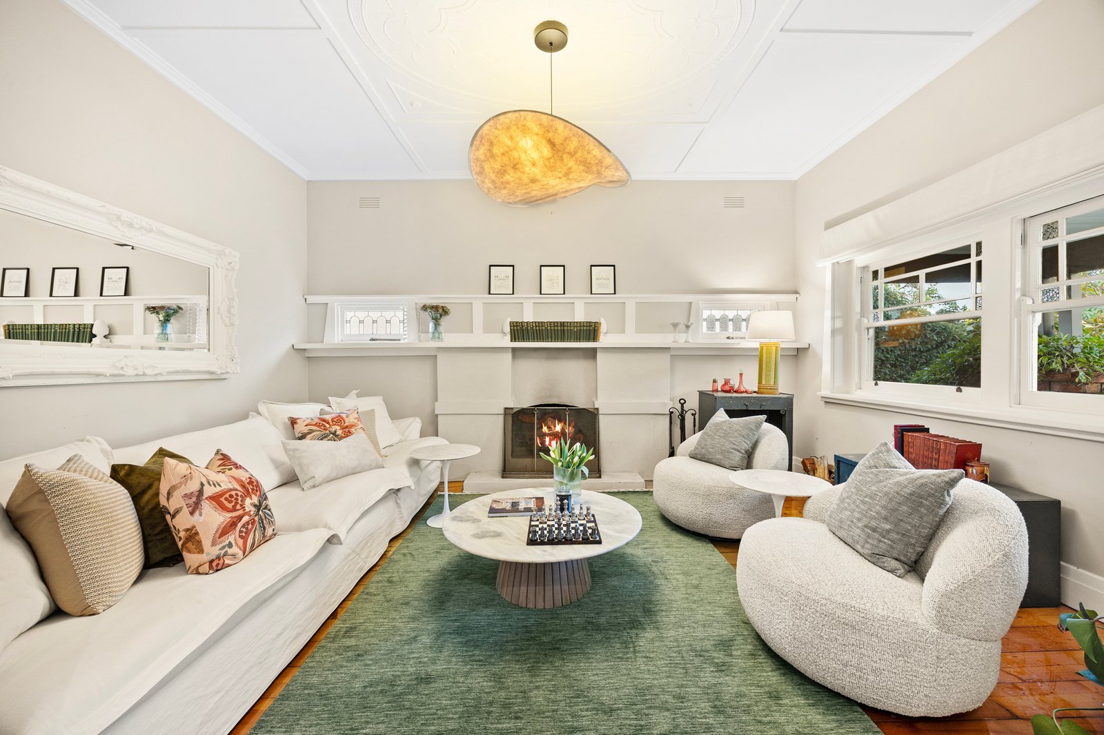 Opposite, the elegant sitting room mirrors the leafy outlook and is enriched by decorative ceilings and a warming open fireplace - a refined space for quiet evenings.