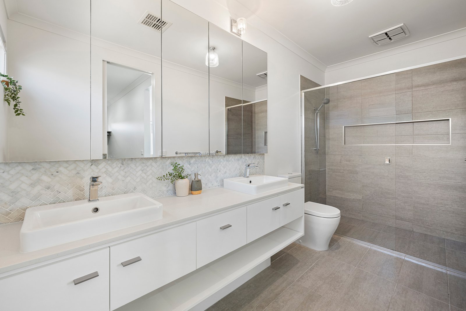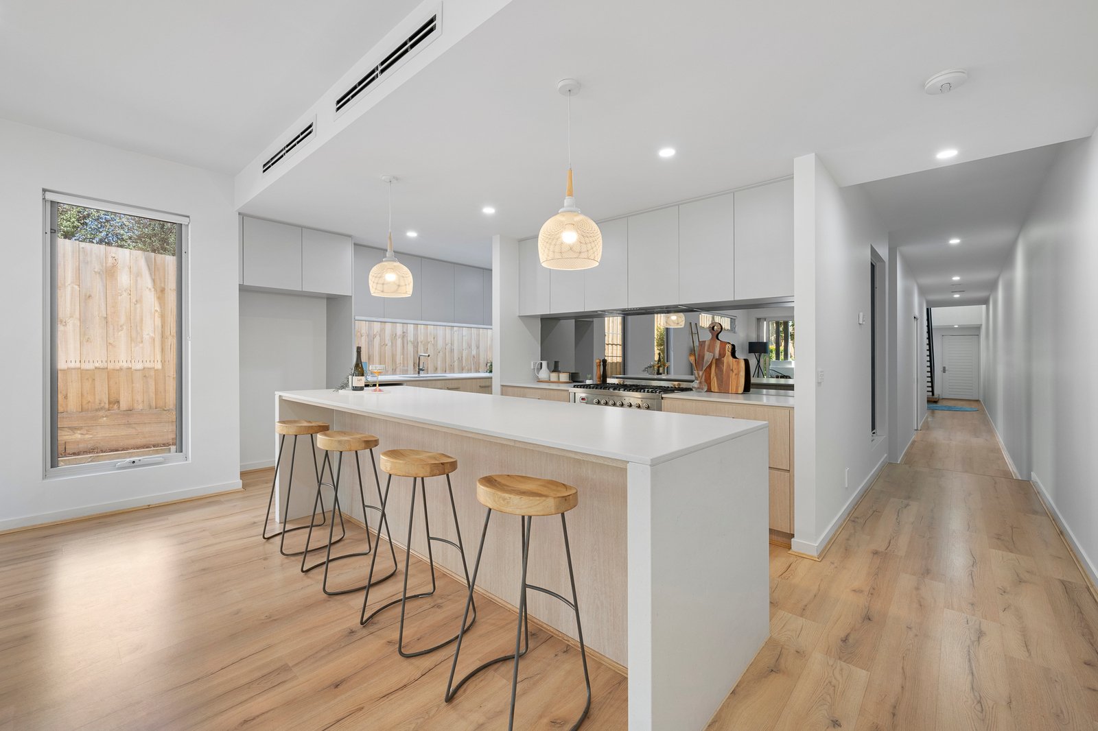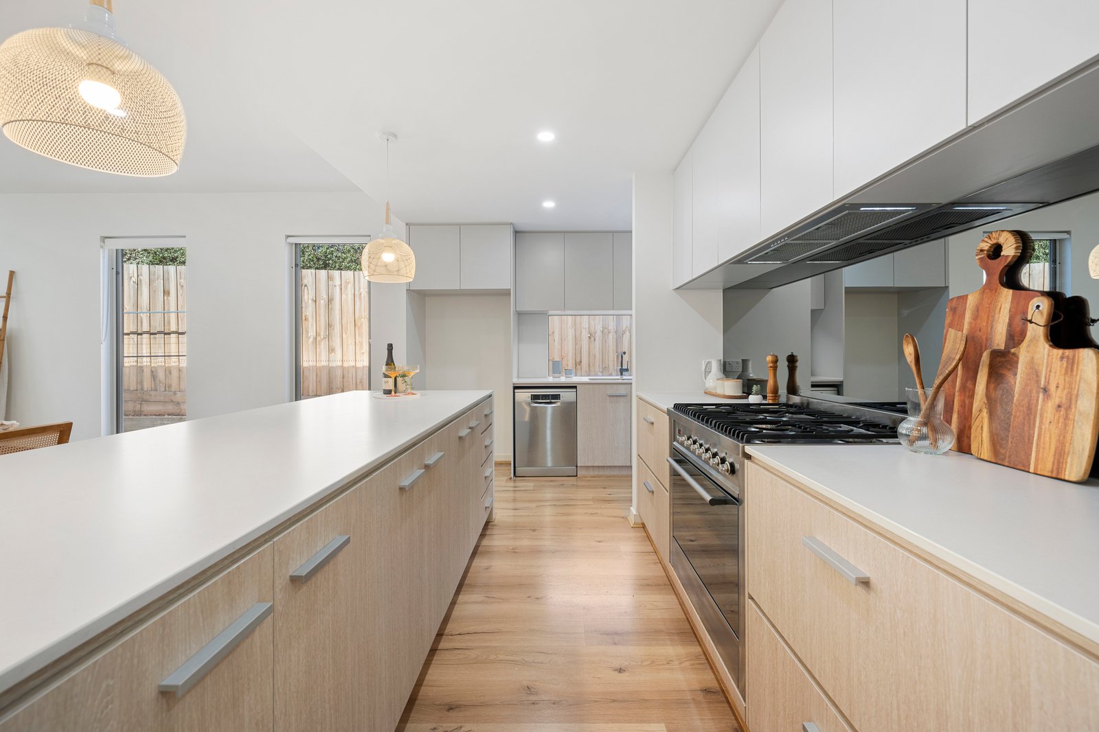 Bathed in natural light, the home’s coveted north-facing orientation elevates the open-plan living and dining area. Imposing with its towering ceilings, warm woodgrain floors, and designer lighting, the space features a kitchen equipped with Ilve 900mm appliances, a Bosch dishwasher, and a clever hybrid butler's pantry. Seamless indoor-outdoor flow is achieved via stacker sliding doors leading to a covered alfresco patio - complete with provisions for an outdoor kitchen- overlooking manicured, child-friendly gardens.