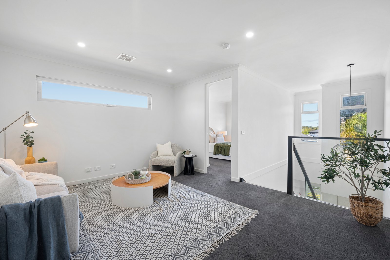 The floorplan is designed for ultimate flexibility to suit every stage of family life. The upper level features three spacious bedrooms with fitted robes, including a master suite with a massive walk-in robe and a chic ensuite. A central family bathroom and a relaxing second living area create a perfect retreat for children or teenagers. On the ground floor, a versatile fourth bedroom or third living zone sits adjacent to a full guest bathroom featuring its own shower, providing a private sanctuary for grandparents or long-term guests. A dedicated private study ensures a quiet professional environment, complemented by a custom-fitted laundry.