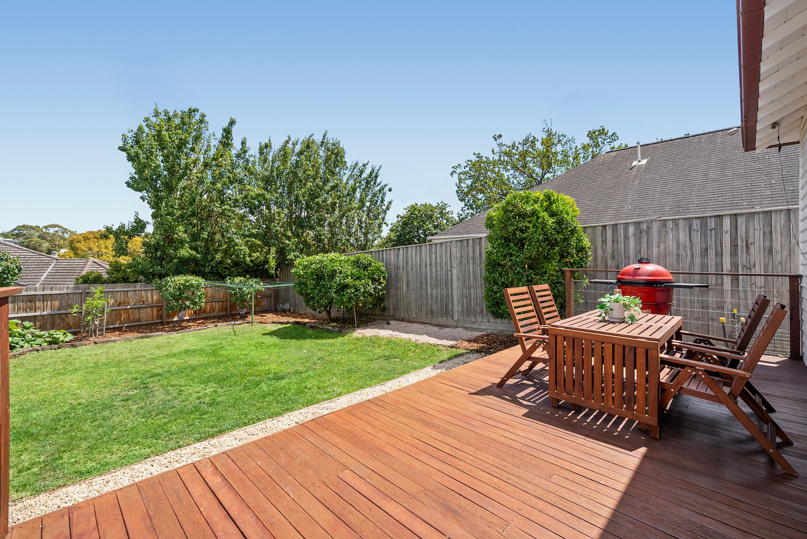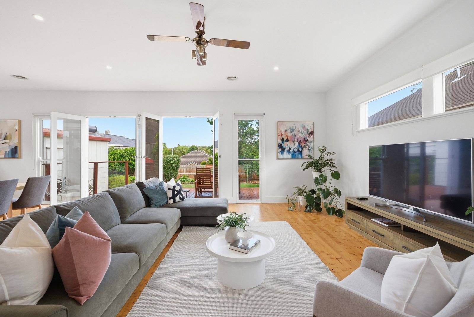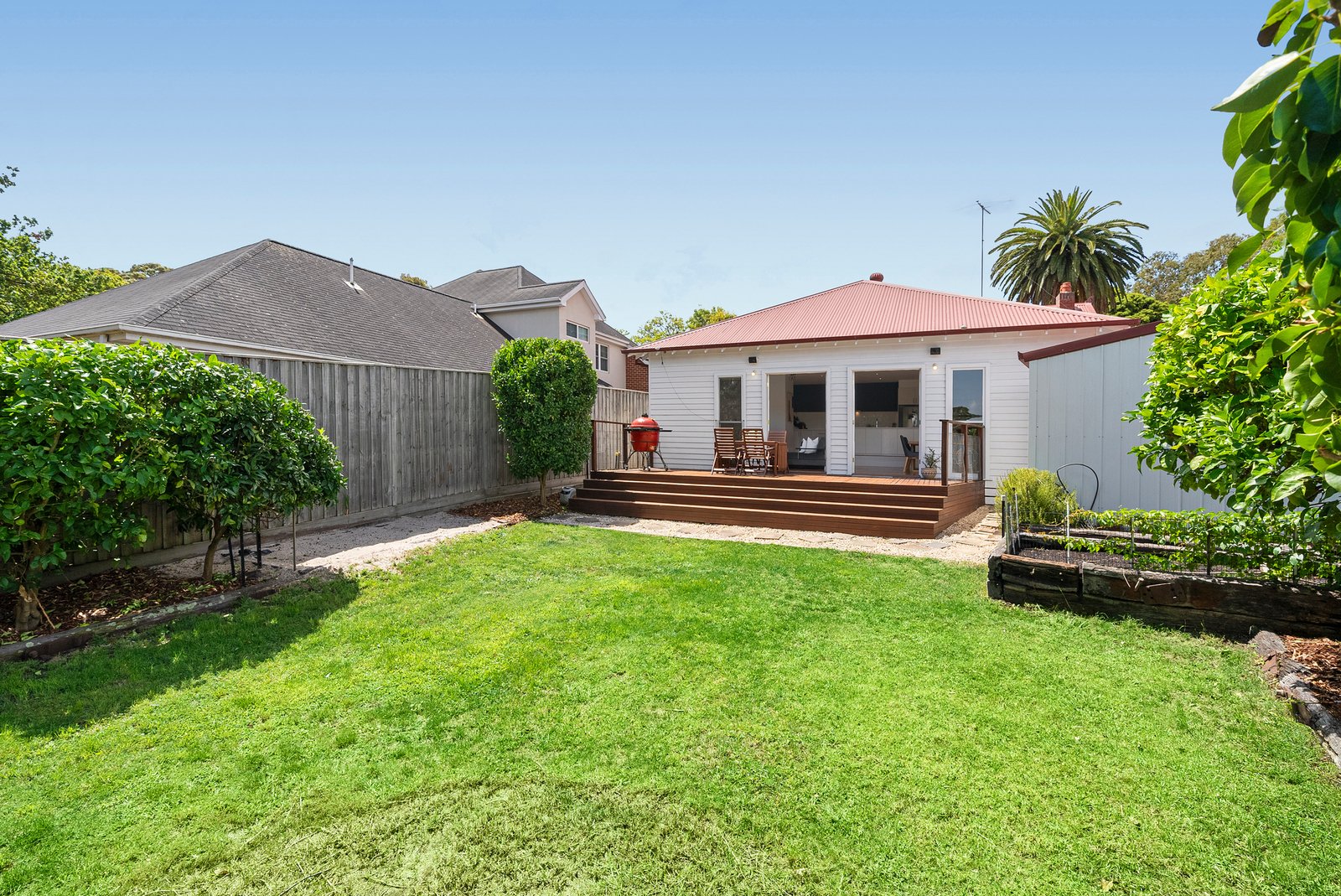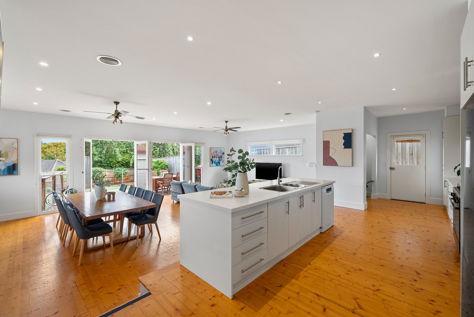 Polished timber floors, soaring ceilings and decorative roses define the gracious front rooms, offering flexibility as additional living, home office or retreat spaces. At the rear, an expansive open-plan living and dining domain impresses with its scale and connection to the outdoors, spilling onto a generous timber deck and private garden framed by established fruit trees and a productive veggie patch.