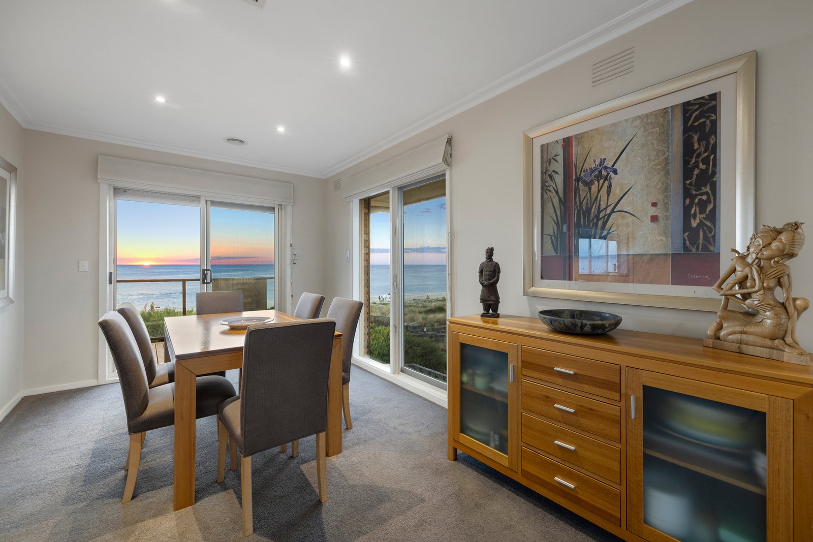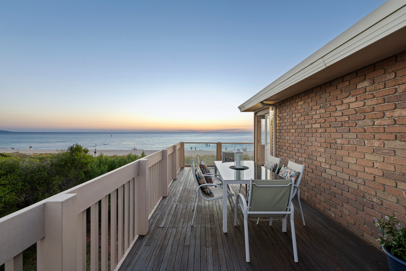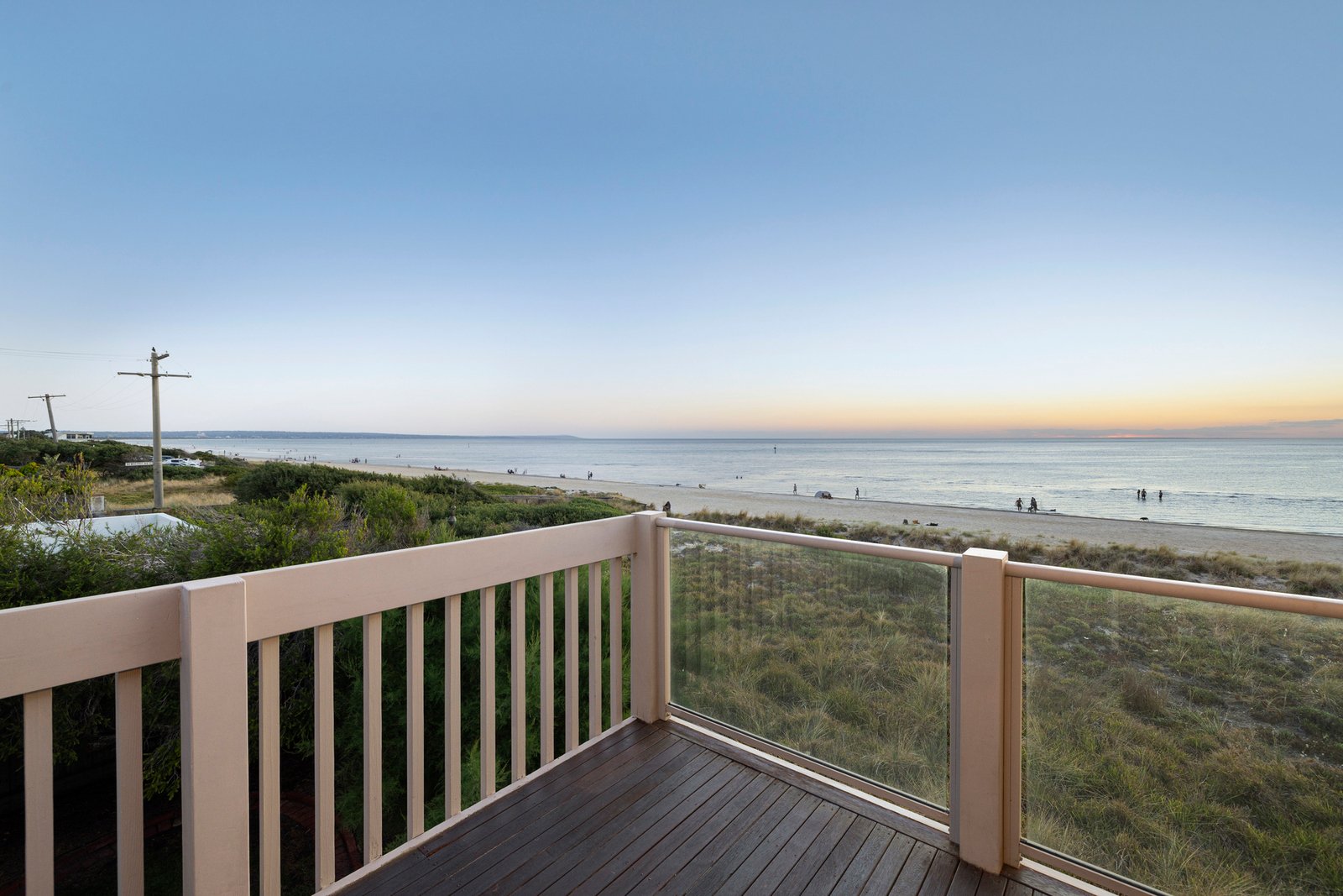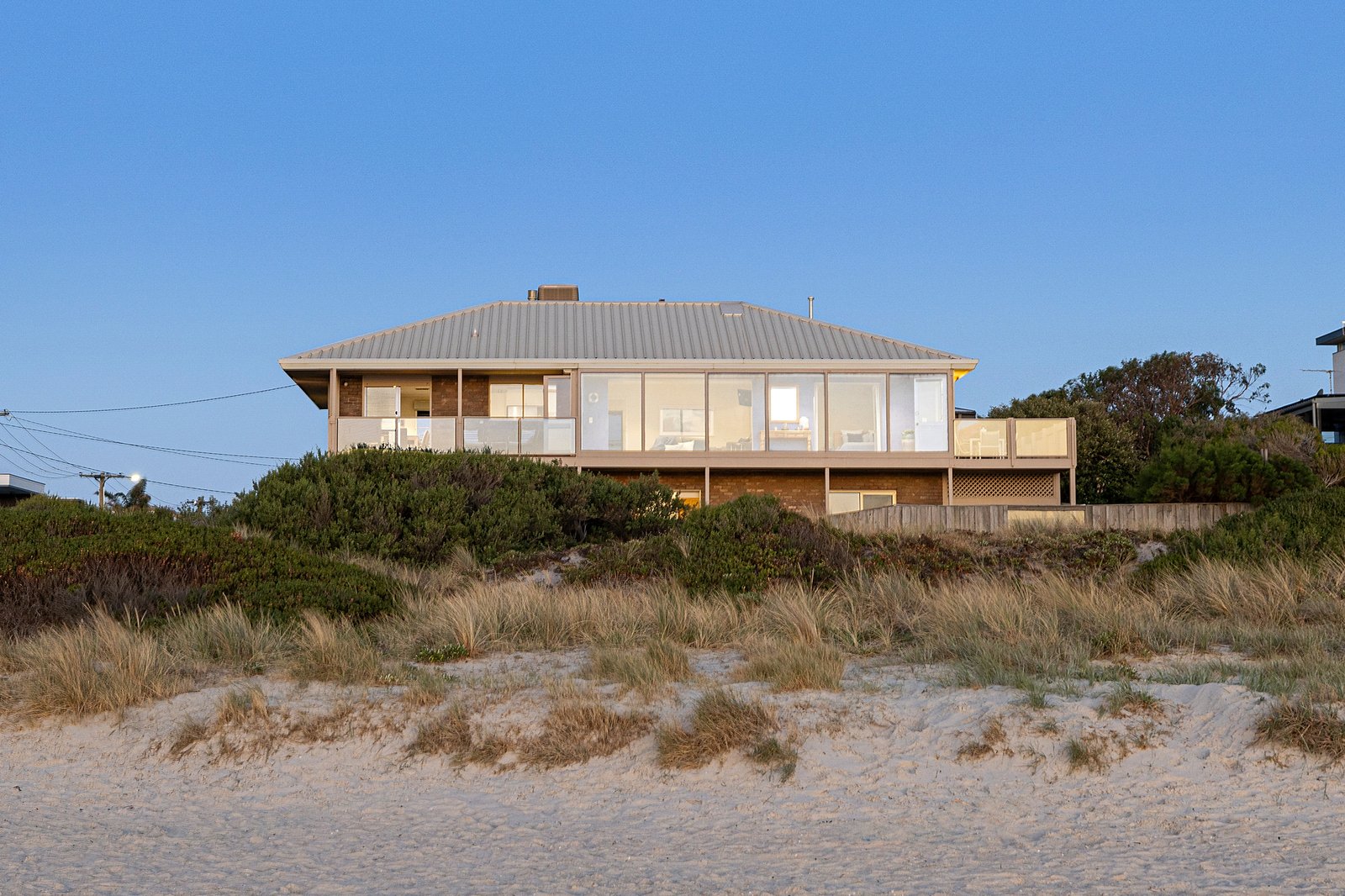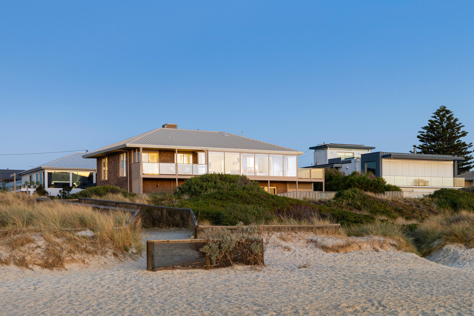Exceptionally warm & inviting, the current accommodation is effortlessly elevated by dramatic world-class panoramas both upstairs and down. With a reverse floorplan that allows the vistas to take centre stage, the existing home comprises a choice of versatile living areas, including a ground-floor rumpus room. Upstairs, the family room is blessed with broad, floor-to-ceiling glass, framing picture-perfect postcard views of sand and sea. A formal lounge with cosy gas fireplace takes care of winter nights at home, while also offered are a practical kitchen, dining area, four bedrooms - main with incredible outlooks - and two bathrooms. A full laundry can be found in the over-sized double auto garage, and the home boasts evaporative cooling, heating and substantial storage throughout. Outside, the garden is both child and pet-friendly and includes securely gated beach access, an outdoor shower, external WC and gated access for small boats or trailers, while separate beach-view balconies take care of open-air relaxation and entertaining.