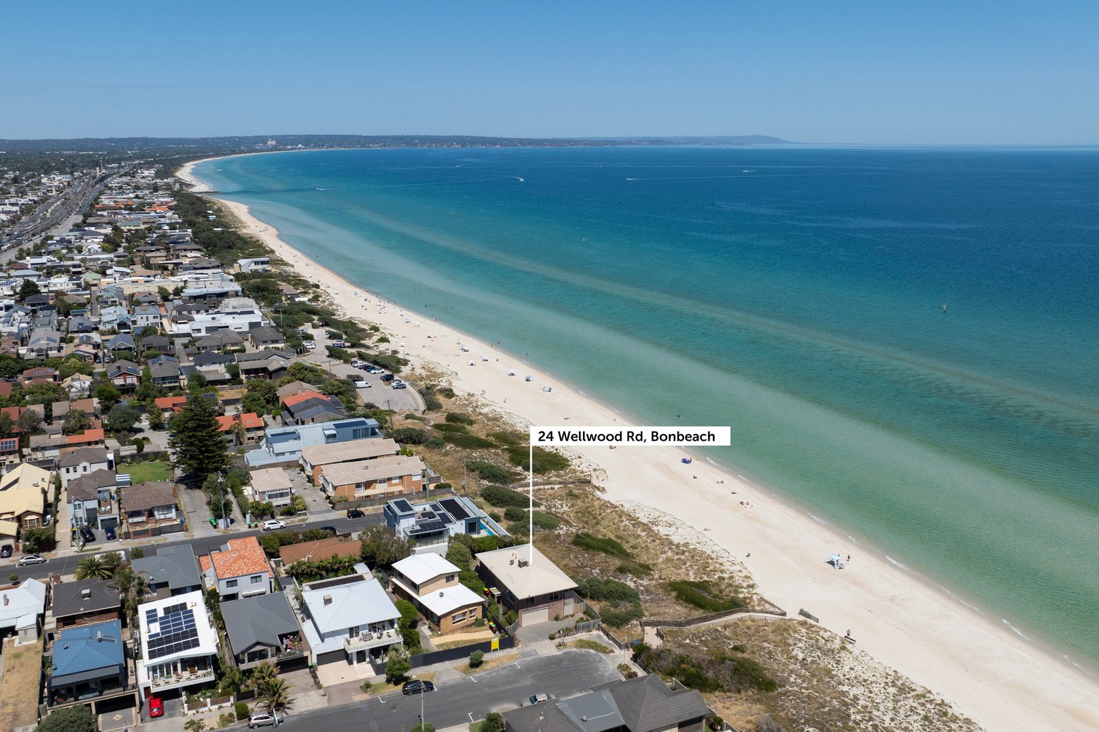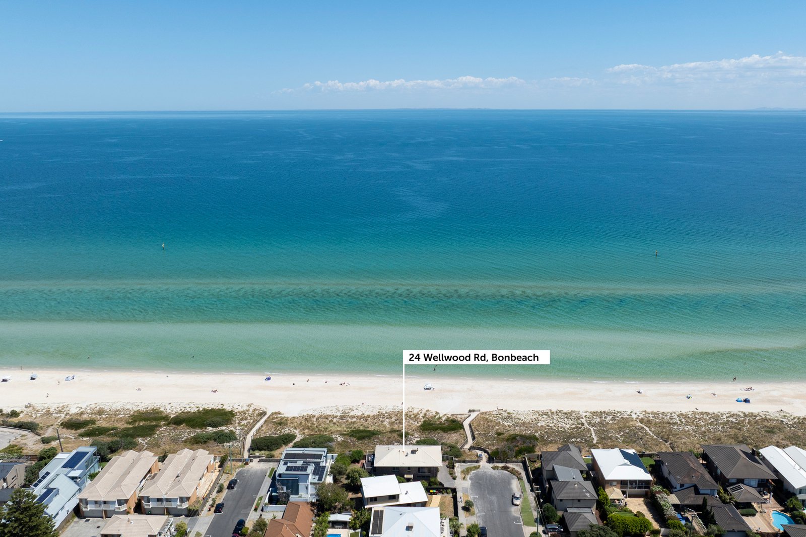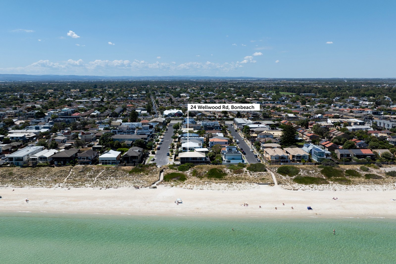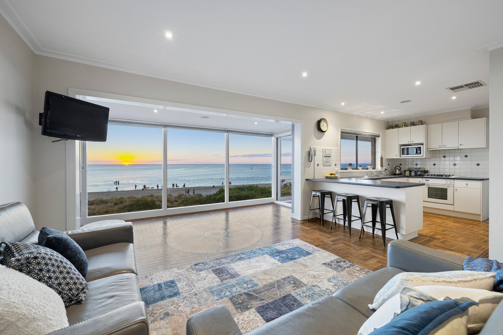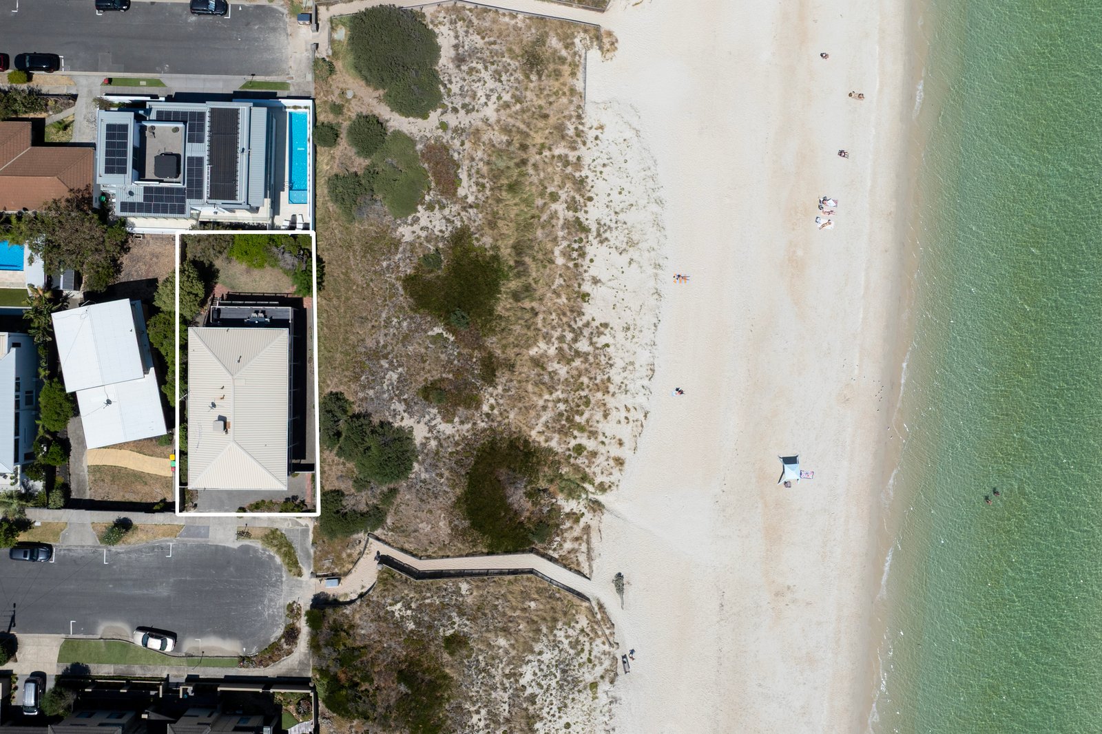 Exceptionally warm & inviting, the current accommodation is effortlessly elevated by dramatic world-class panoramas both upstairs and down. With a reverse floorplan that allows the vistas to take centre stage, the existing home comprises a choice of versatile living areas, including a ground-floor rumpus room. Upstairs, the family room is blessed with broad, floor-to-ceiling glass, framing picture-perfect postcard views of sand and sea. A formal lounge with cosy gas fireplace takes care of winter nights at home, while also offered are a practical kitchen, dining area, four bedrooms - main with incredible outlooks - and two bathrooms. A full laundry can be found in the over-sized double auto garage, and the home boasts evaporative cooling, heating and substantial storage throughout. Outside, the garden is both child and pet-friendly and includes securely gated beach access, an outdoor shower, external WC and gated access for small boats or trailers, while separate beach-view balconies take care of open-air relaxation and entertaining.