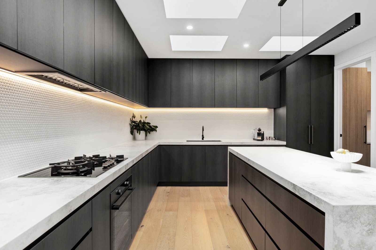 At the heart of the home, the designer kitchen delivers both style and performance, appointed with stone benchtops, a central island, premium appliances and a fully fitted walk-in pantry to support both everyday living and entertaining.