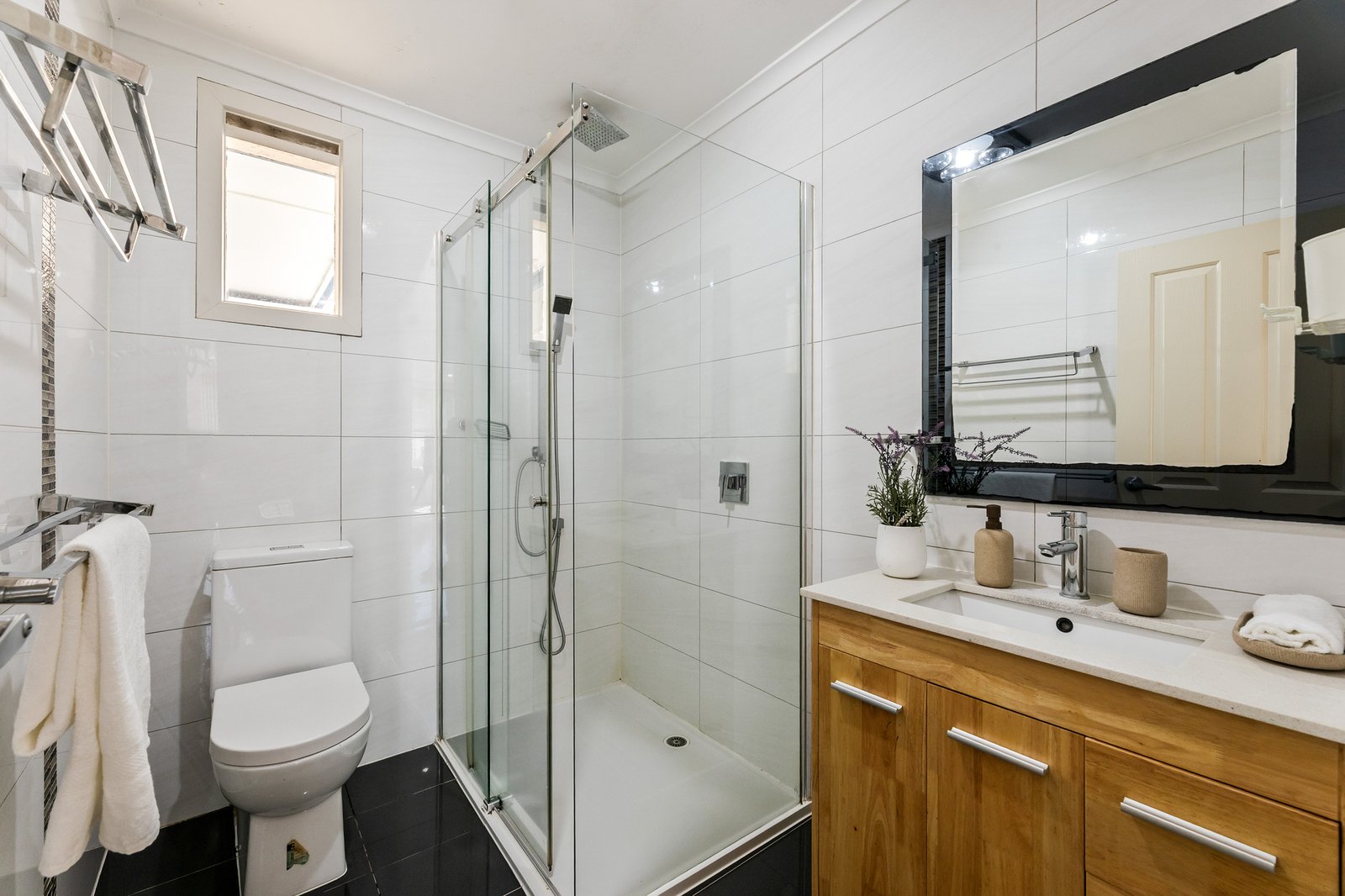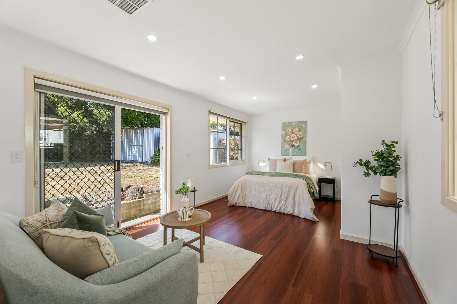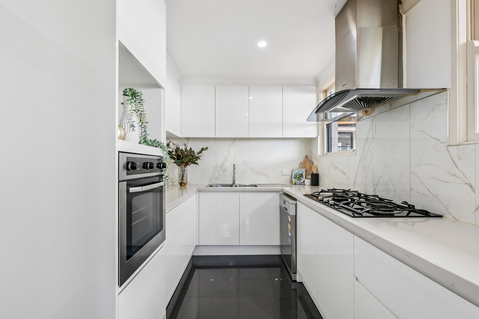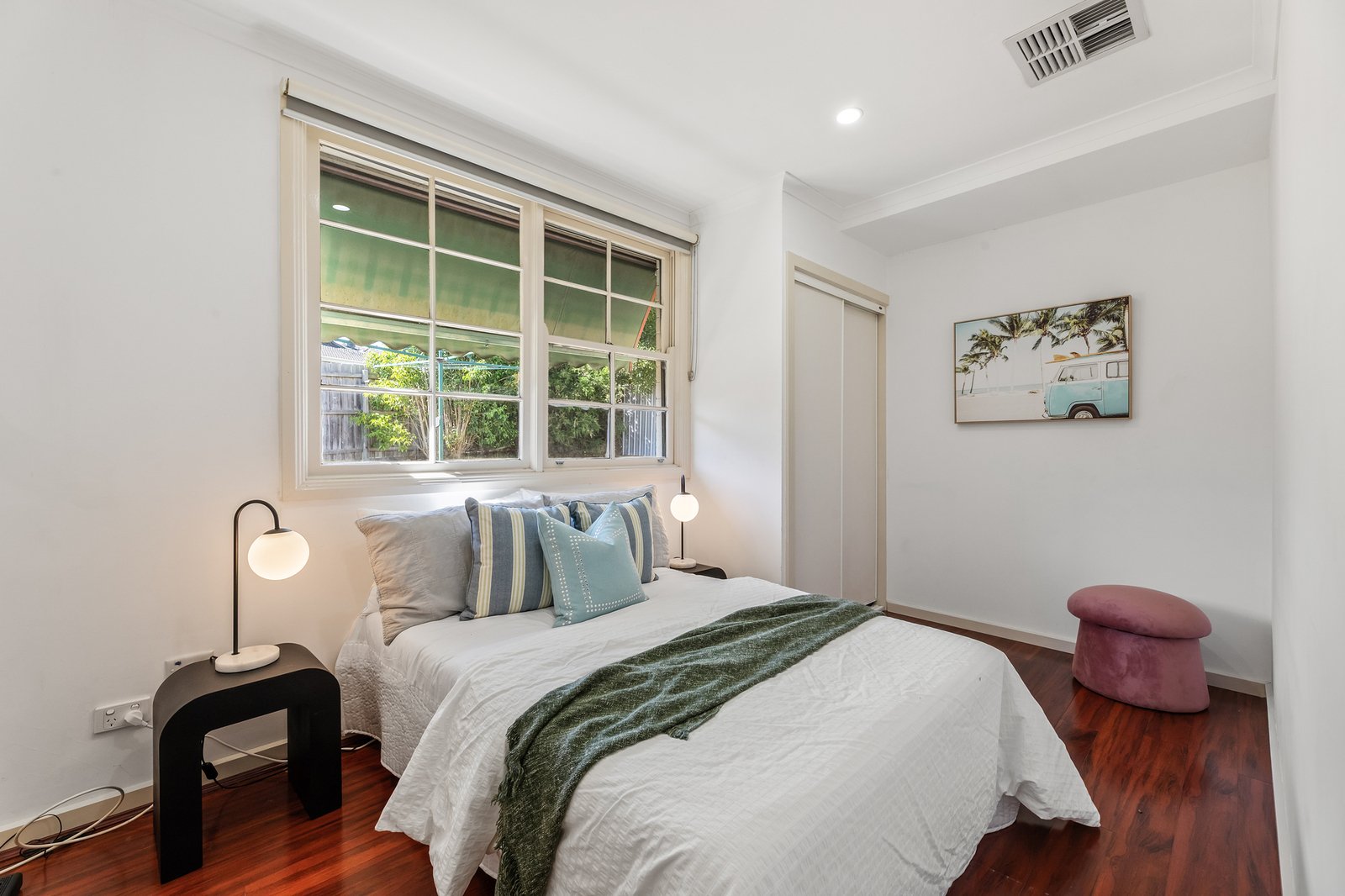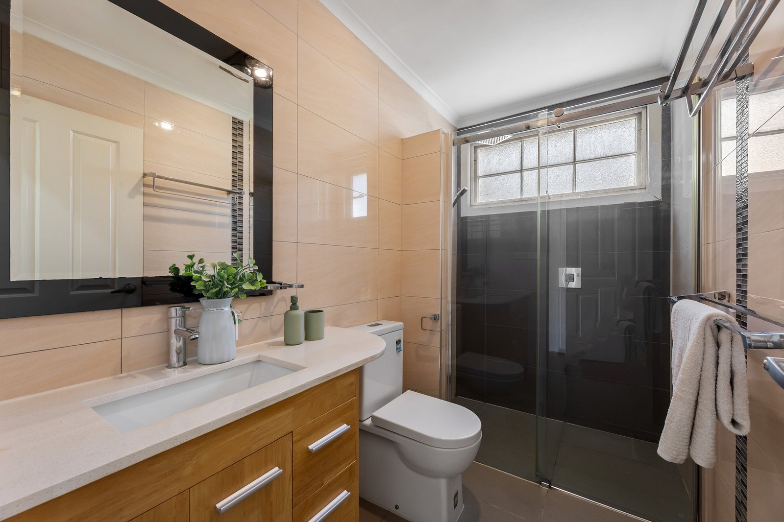 Tiled for easy care, the kitchen is equipped with quality appliances and a dishwasher, with sliding doors leading out from the dining area onto an alluring alfresco deck where you’ll find a kitchenette. Perfect for children of all ages, the accompanying backyard is generously sized and offers a wonderful space for outdoor play.