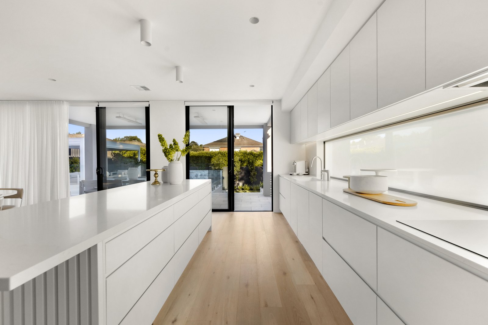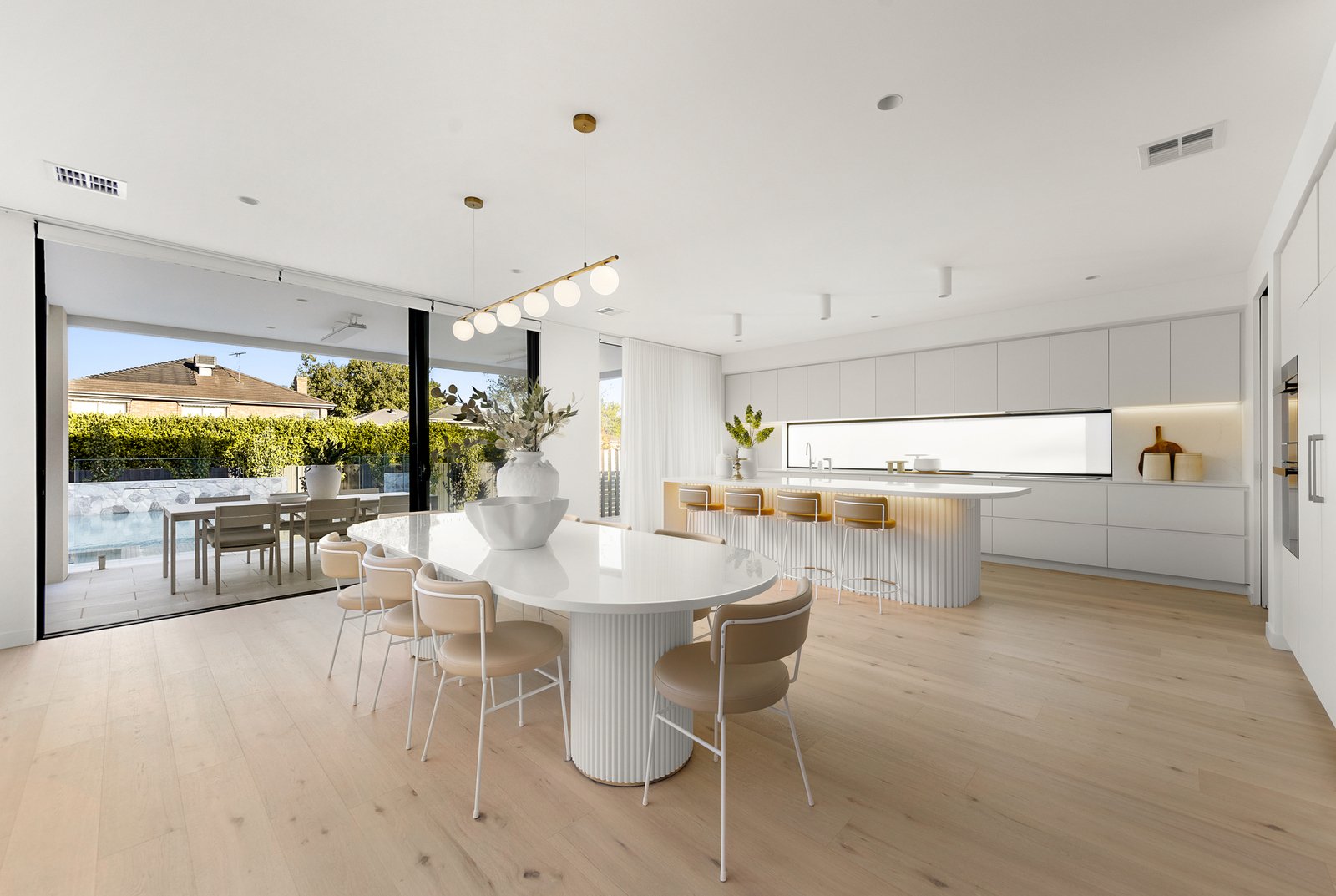 At the heart of the home sits an exceptional chef’s kitchen, finished to a level rarely seen. A custom curved 3-metre island bench makes a statement with vertical battens, under-bench LED lighting, and integrated power—perfect for entertaining, casual meals or family gatherings. Premium appliances include an integrated freestanding Liebherr fridge and freezer with ice machine, a digital integrated dishwasher, dual ovens with self-cleaning technology, and a Miele induction cooktop. Quartz (marble-look) benchtops continue throughout, complemented by soft-close drawers, push-to-open cabinetry, LED lighting under cabinets, an oversized Franke sink, and a Billi hot & cold filtered water tap. A walk-in pantry and full butler’s kitchen complete this incredible setup—keeping the main kitchen pristine while entertaining stays seamless.