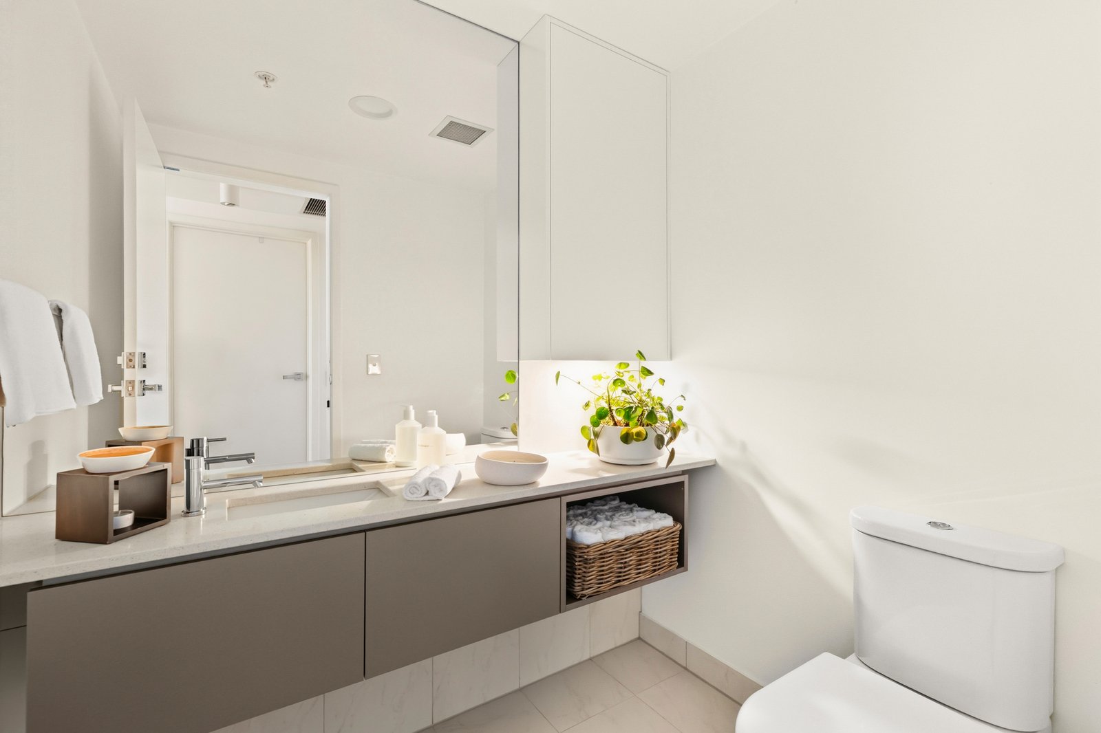 With an ever-changing backdrop of sunrises over CBD skyscrapers, vivid blue skies above the adjoining Yarra, and sunsets over the bay creating fostering a sense of serenity, a supremely spacious plan places functional simplicity at the fore. City lights bring verve and occasion to nights alongside friends, with broad living, dining, and covered terrace spaces combining to form a stunning entertainer’s suite. Ribbons of Calacatta marble take centre-stage in a kitchen tailor-made for the passionate cook, accompanied by profuse cabinetry, an integrated fridge/freezer, and full suite of Miele appliances in a conventional oven, combi microwave/oven, induction cooktop, integrated dishwasher, rangehood, and wine fridge.