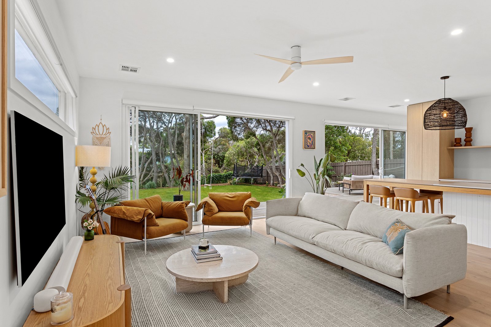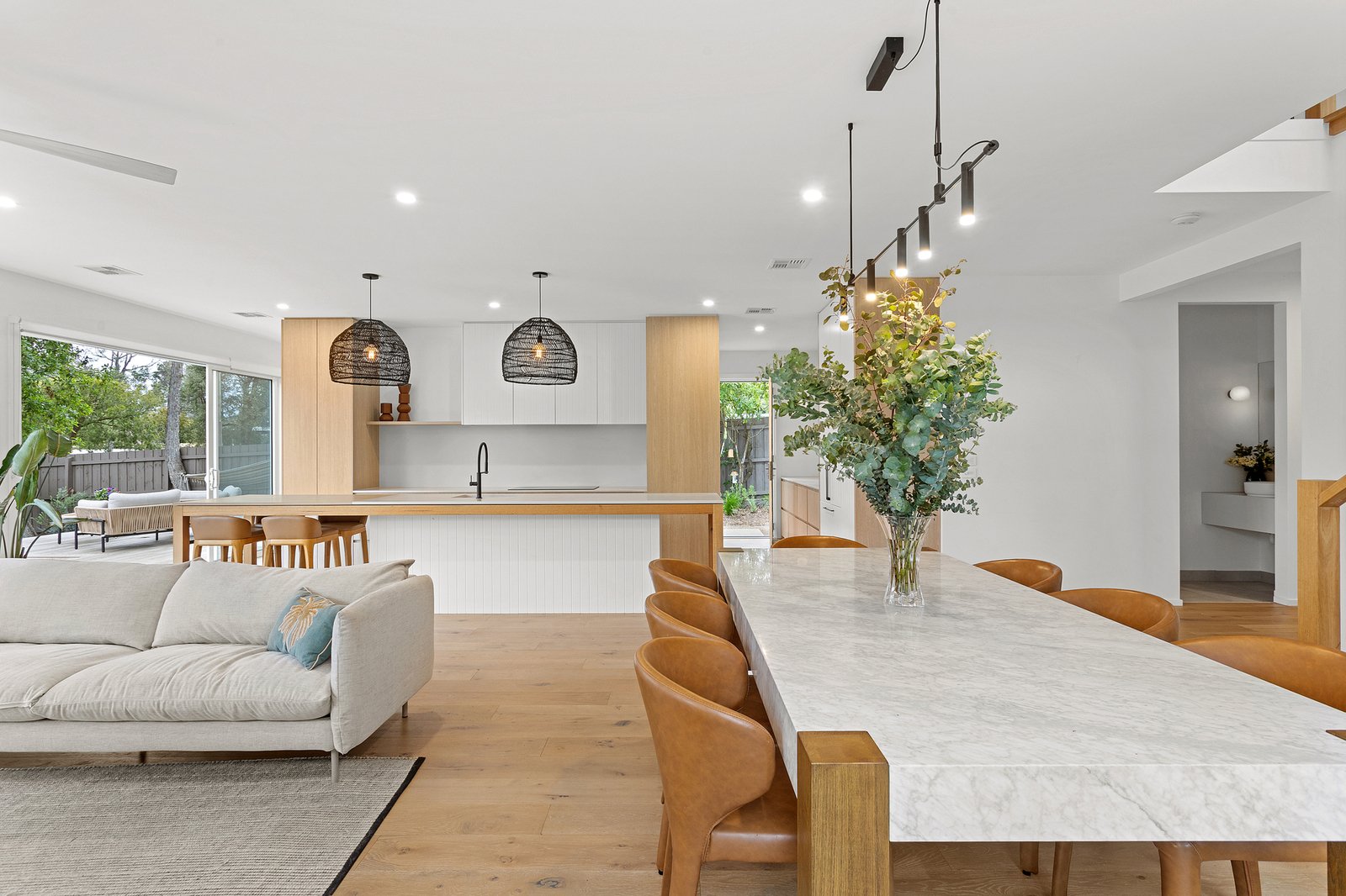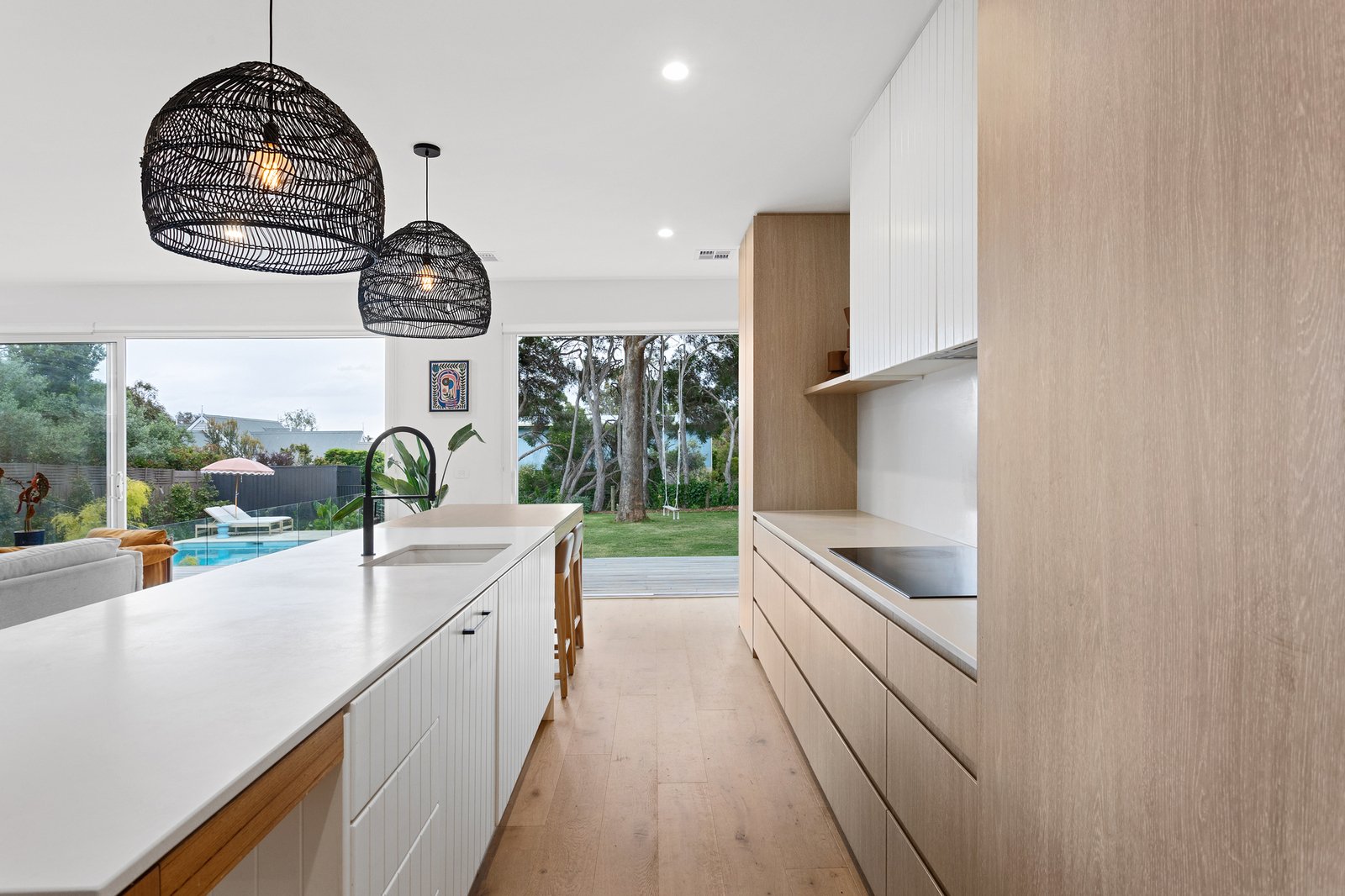Angled for entertaining beneath high ceilings, the open-plan kitchen, living and dining domain unfolds to a broad expanse of stepped Ironbark decking, creating an effortless setting for family and friends to gather. A Caesarstone Crisp Concrete island anchors the chef’s kitchen and adjoining butler’s pantry/laundry, its neutral coastal palette complemented by extensive oak cabinetry and a Fisher & Paykel suite with an integrated fridge–freezer, induction cooktop, pyrolytic oven and dishwasher.