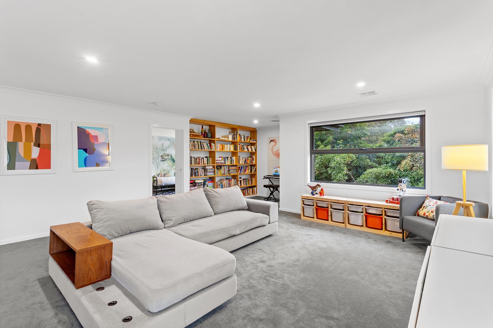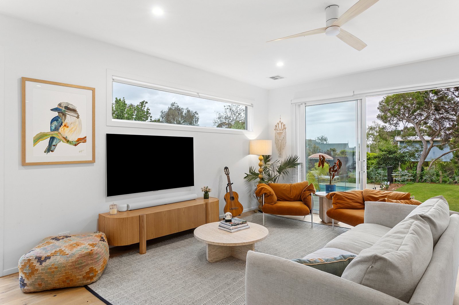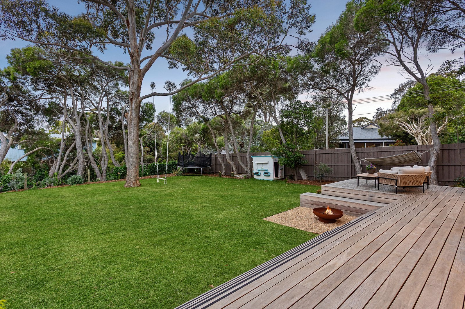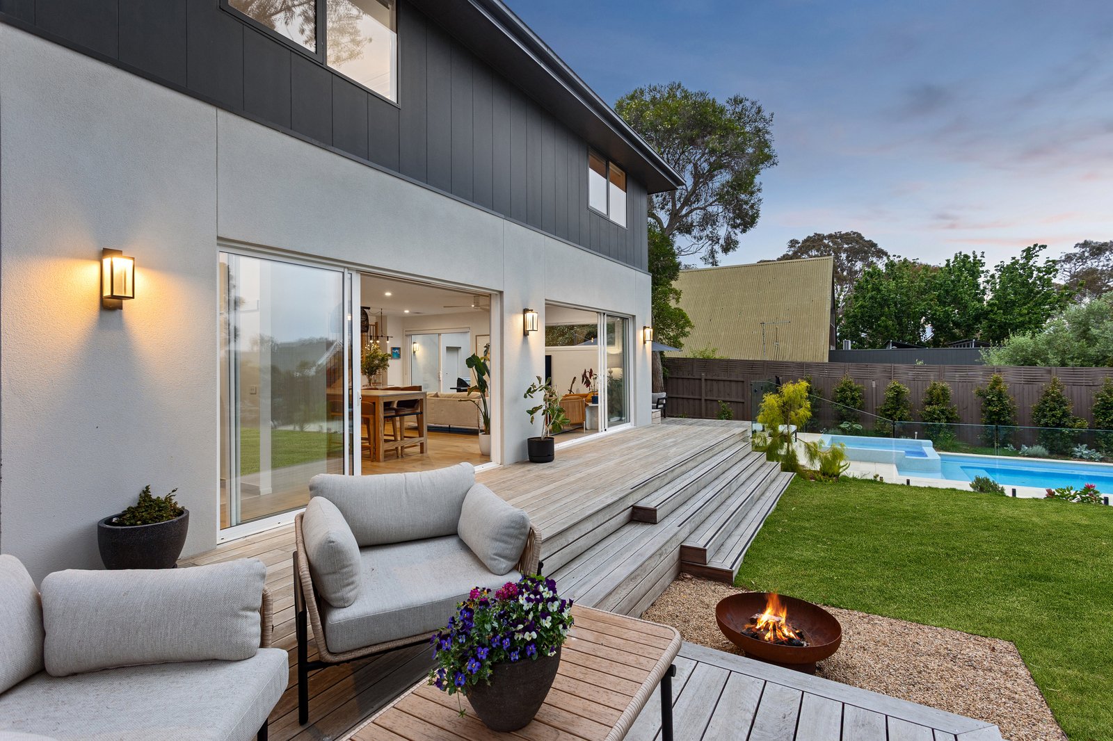 North-facing and overlooking the tiled pool and spa, the rear garden extends the home’s entertaining focus outdoors, where a firepit zone and broad lawn invite play and relaxation beneath established gums and native trees that line the perimeter.