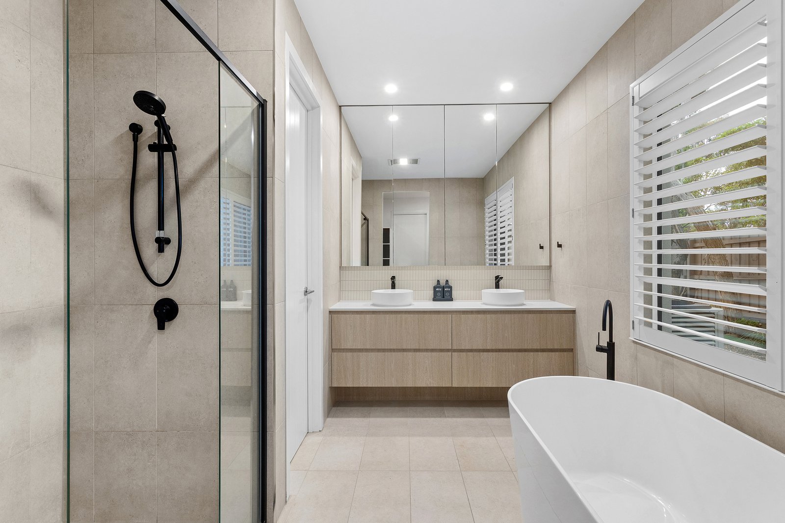 The primary suite rests on the lower level and impresses with a walk-in robe and indulgent ensuite finished in full-height tiles, featuring a freestanding bath, rain shower, double vanity and Phoenix tapware carried throughout. Upstairs, four additional bedrooms include three with walk-in robes; two sharing a Jack-and-Jill bathroom, complemented by a lounge, home office and an additional bathroom with a separate WC.