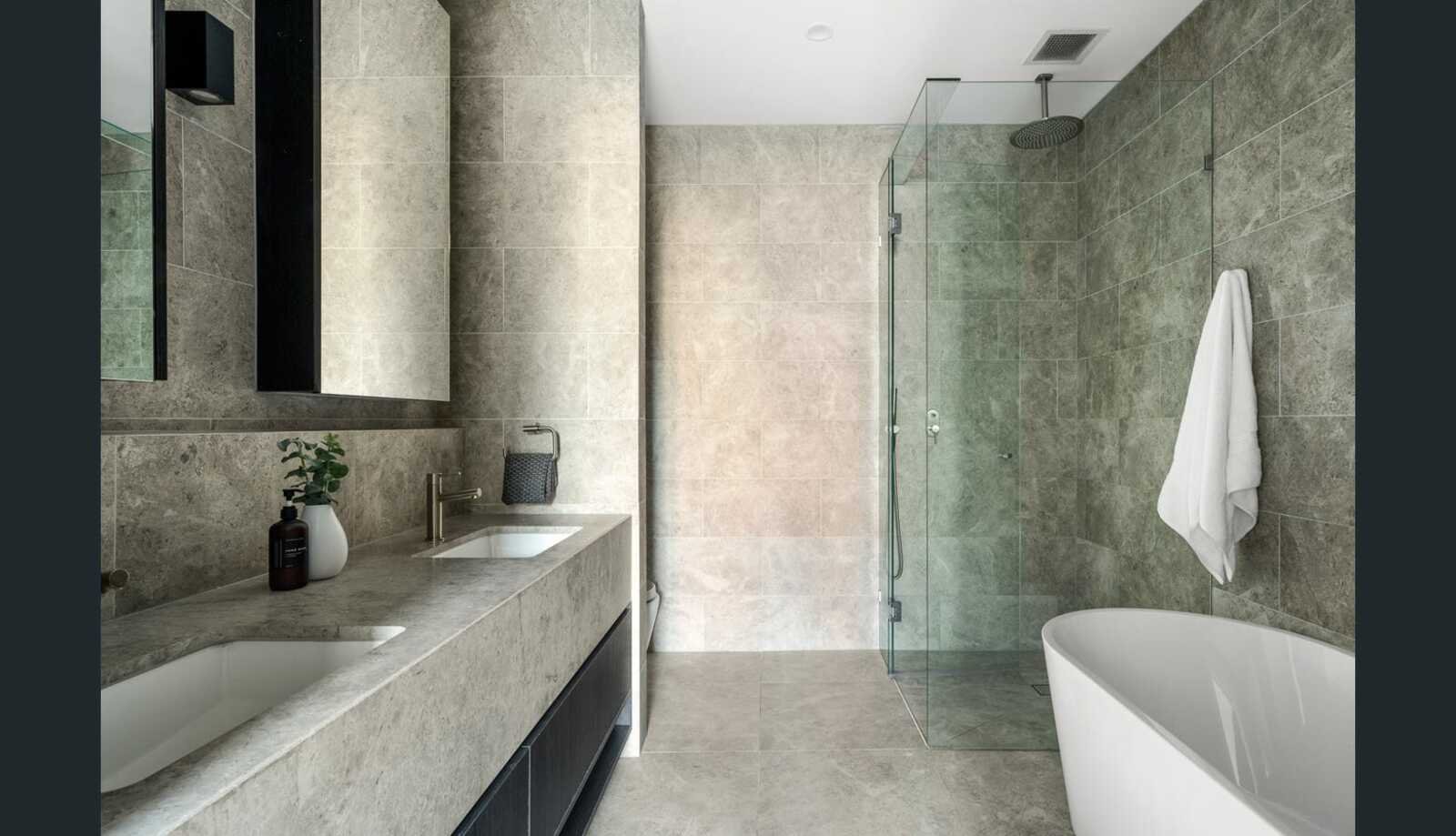 * Luxurious twin-vanity bathroom featuring a freestanding bath, Milano tapware, floor-to-ceiling tiles and a rainfall/hand-held shower