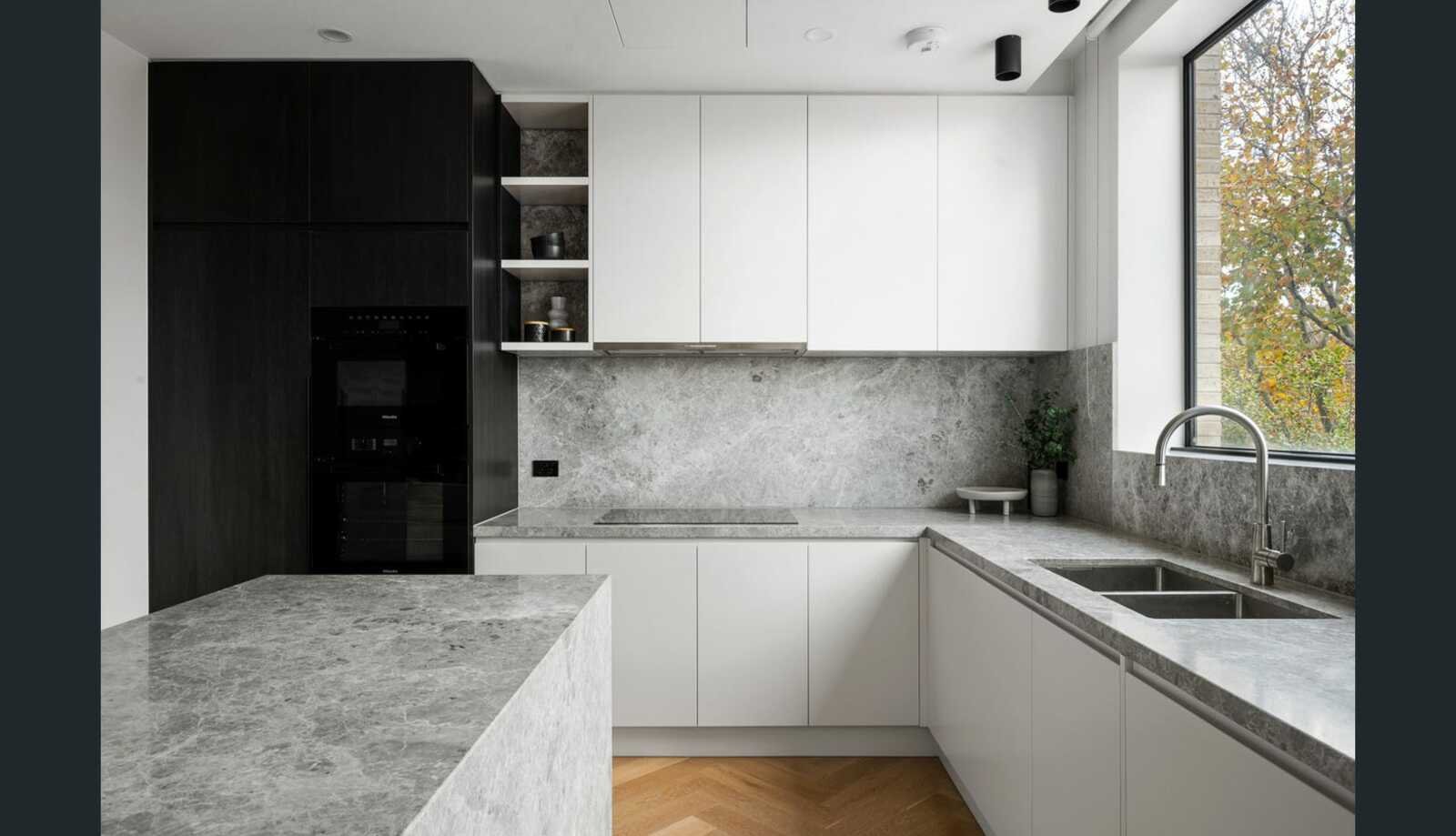 * All-new kitchen showcasing an island bench, marble surfaces, Miele appliances including two ovens and an induction cooktop, an integrated Fisher and Paykel dishwasher and fridge/freezer