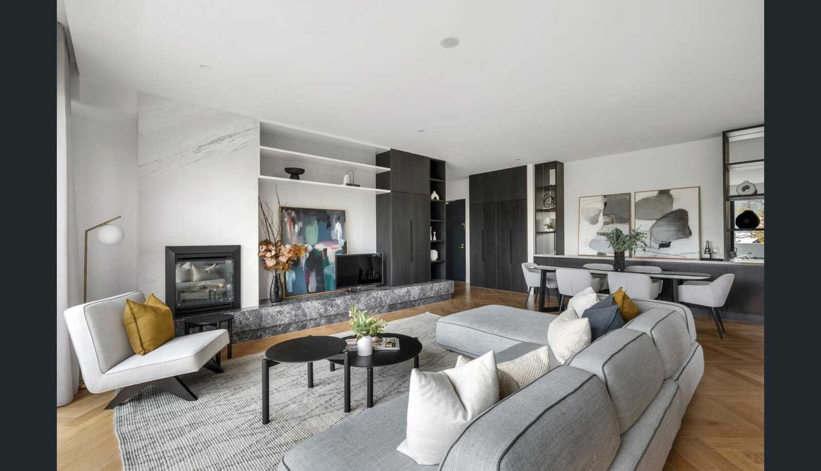 * Gallery-sized open-plan living and dining with a gas log fireplace and bespoke cabinetry