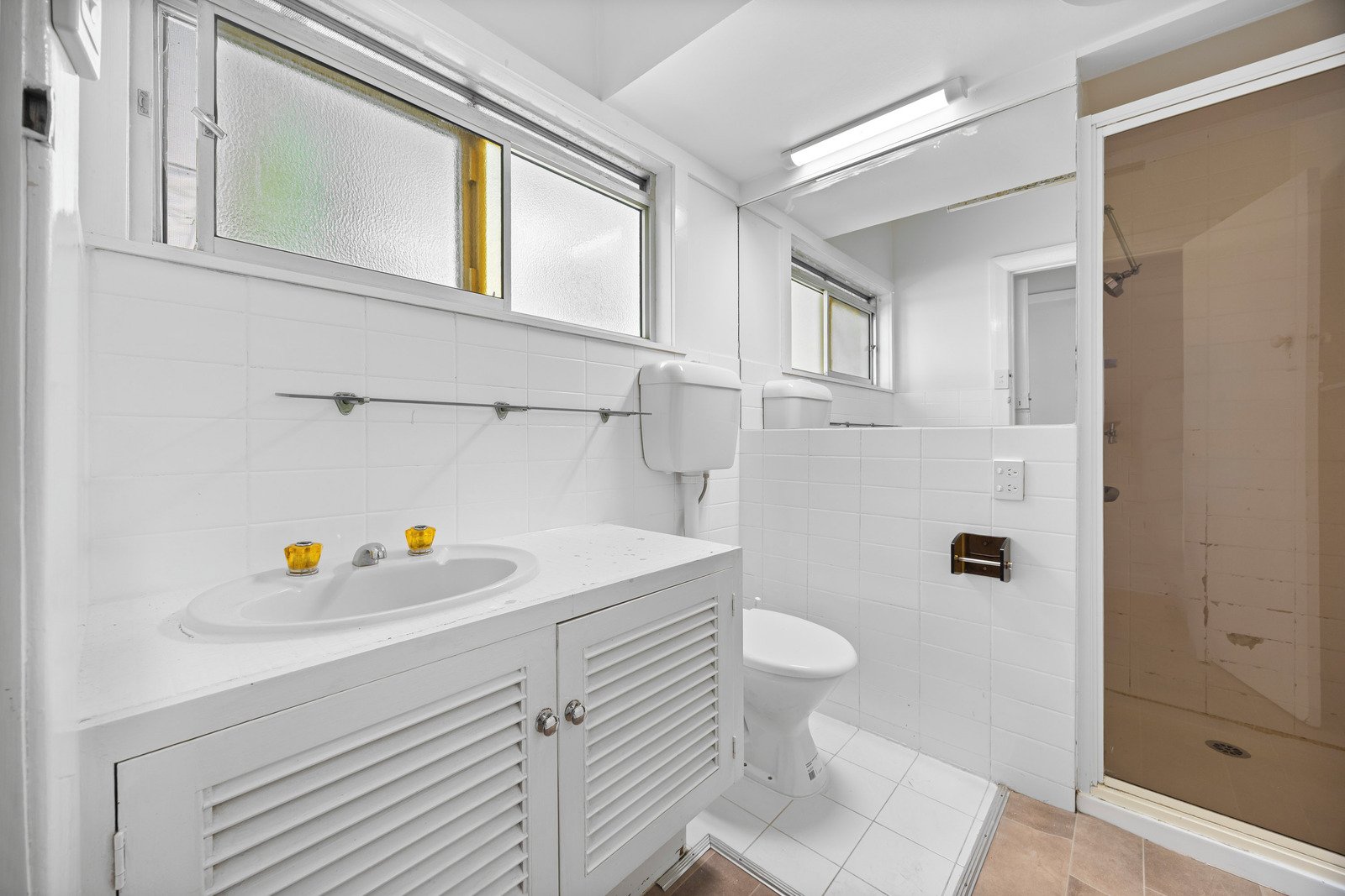 - Bathroom with shower and vanity