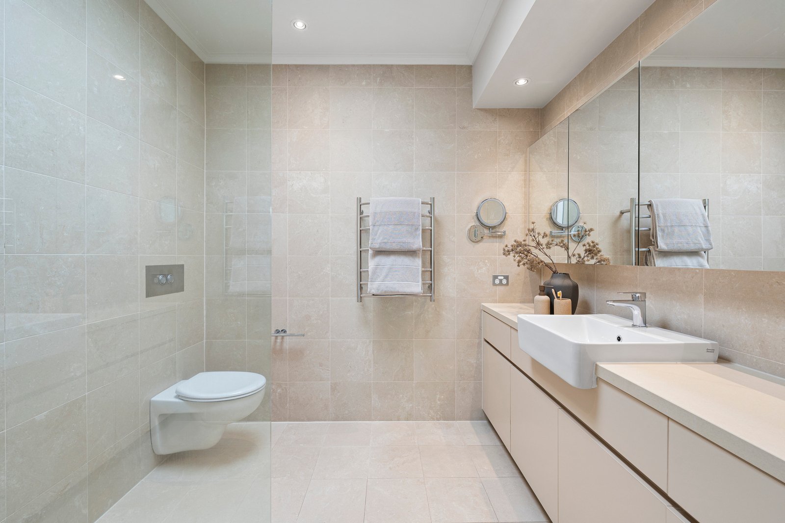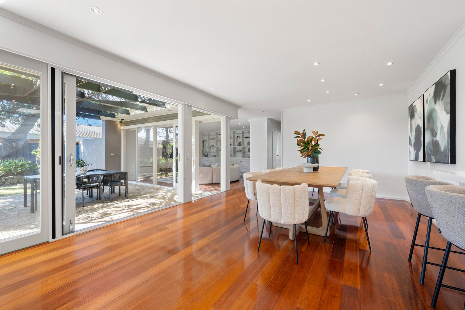 Oversized sliding doors retract to create a true indoor-outdoor experience, extending dining and entertaining onto a crazy-paved patio surrounded by established coastal banksia and tropical palms. Here, the landscaped grounds create a private oasis of sun-filled tranquillity beside the in-ground pool — a setting equally suited to summer gatherings or quiet afternoons at home.
