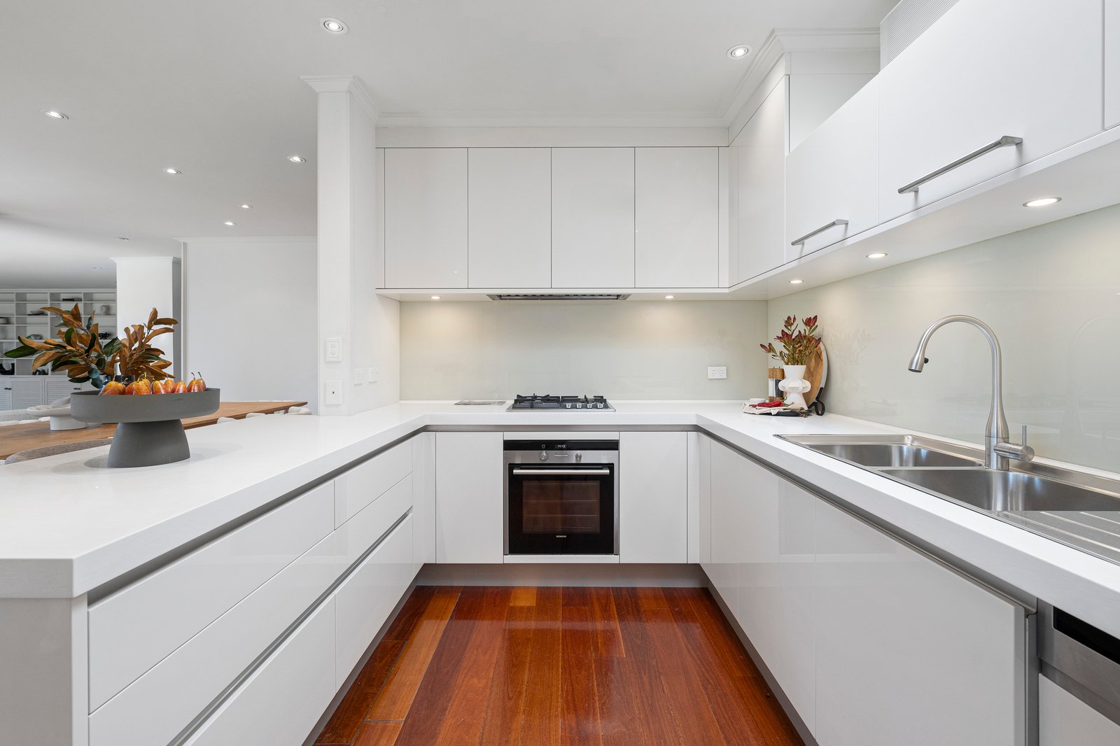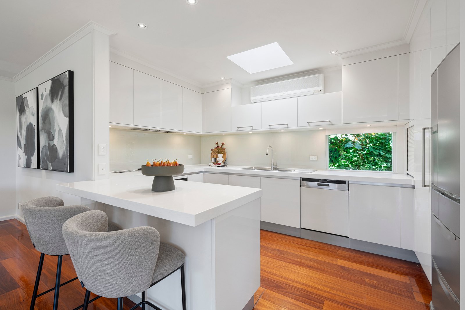 Brilliant northern light washes across the interiors, drawing you toward a wisteria-draped alfresco terrace that connects seamlessly to a sunken lounge and the open-plan family and meals domain. Each space flows intuitively into the next, designed to encourage both relaxed day-to-day living and effortless entertaining. Custom built-in joinery conceals a sophisticated cocktail bar, while the renovated kitchen forms a striking centrepiece beneath soaring skylights. Appointed with premium Siemens appliances, it balances architectural purity with contemporary functionality.