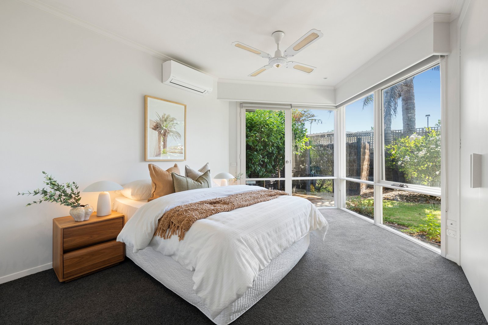 While rich in mid-century character and minimalist integrity, the home also delivers turnkey ease for modern family life. Split-system heating and cooling, solar power, garden irrigation and an oversized automated double garage with exposed aggregate driveway ensure comfort and practicality without compromising the architectural vision.