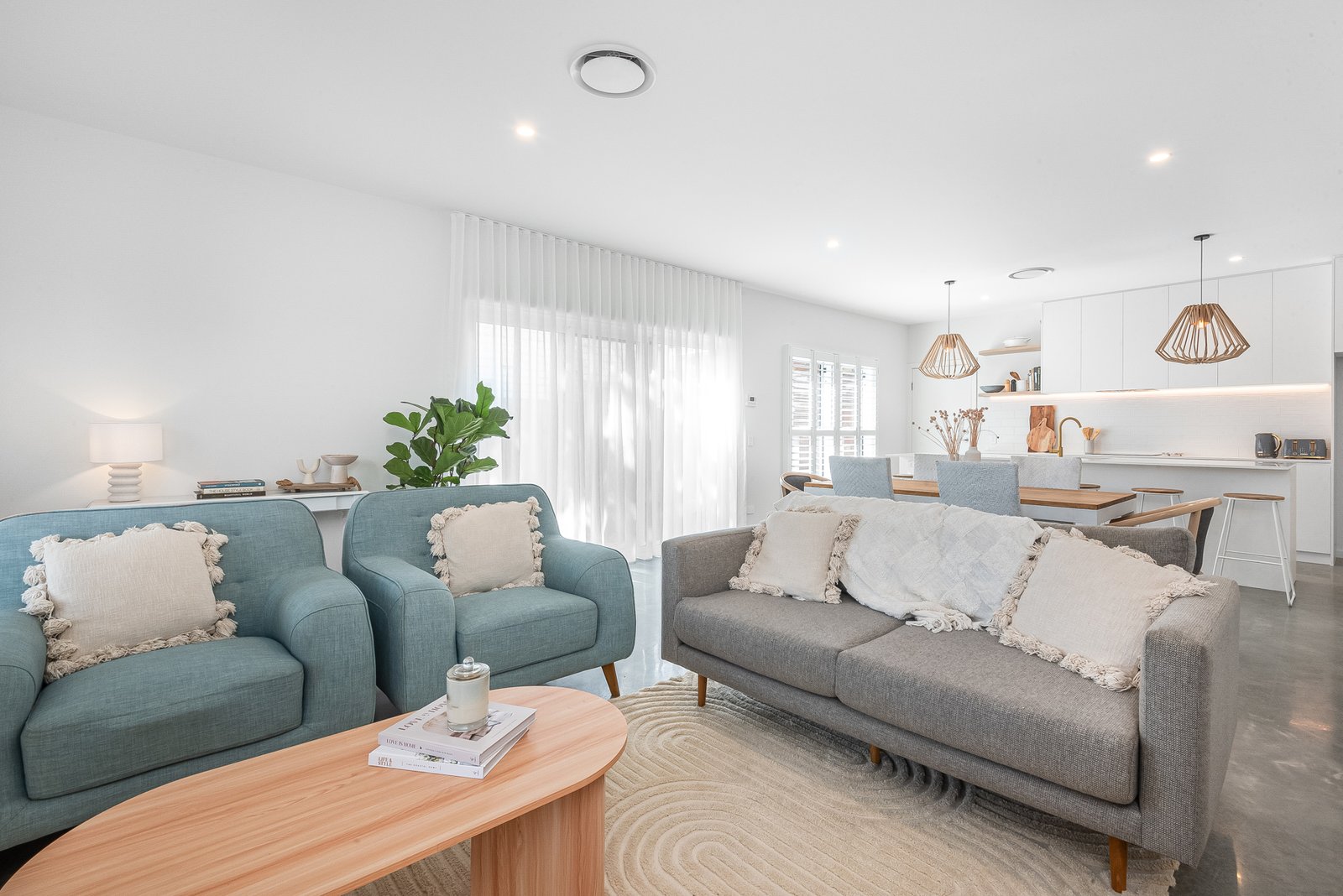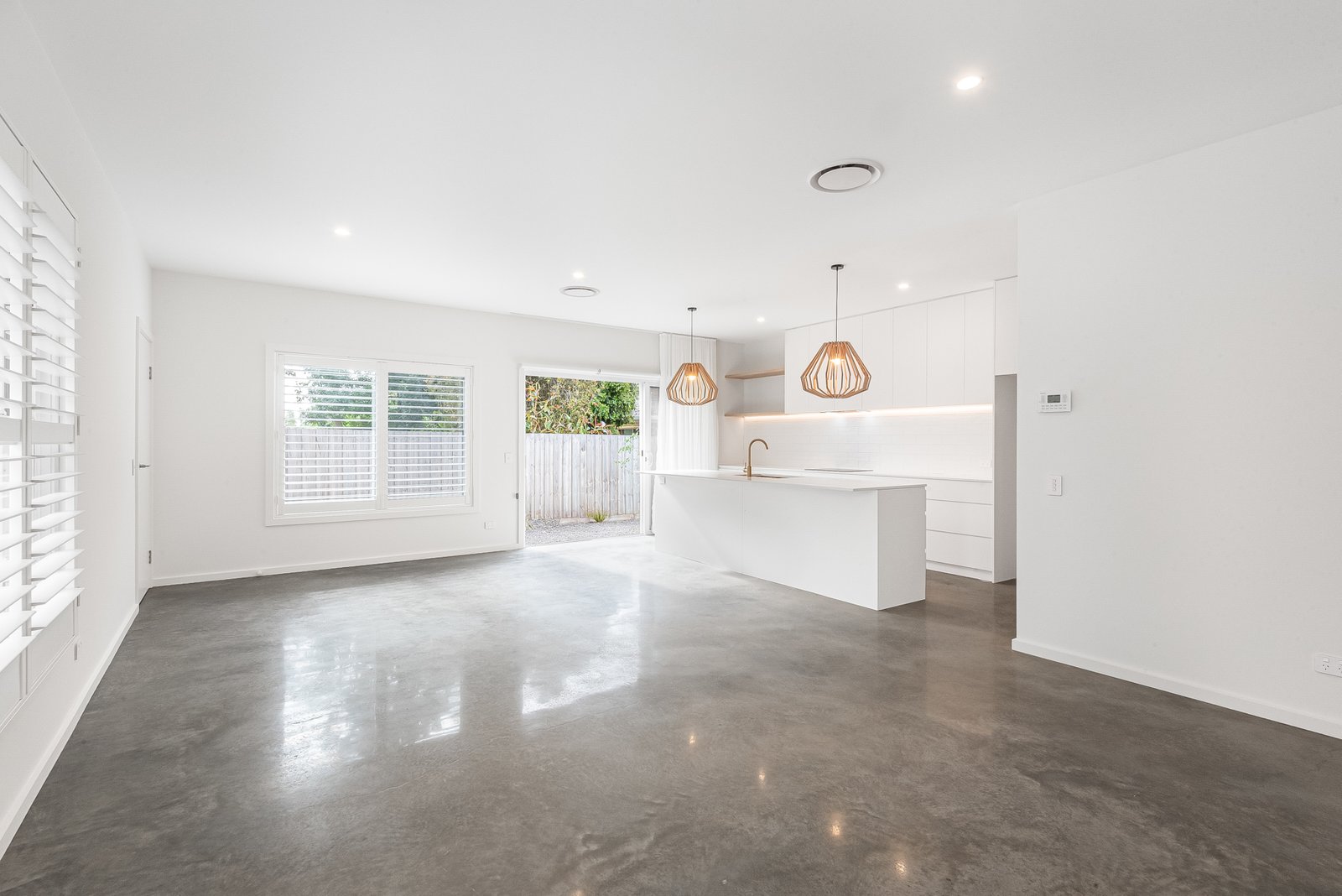 Downstairs: Open-plan living, dining, and kitchen area with polished concrete floors and floor-to-ceiling linen sheers, all opening onto a private, enclosed courtyard.