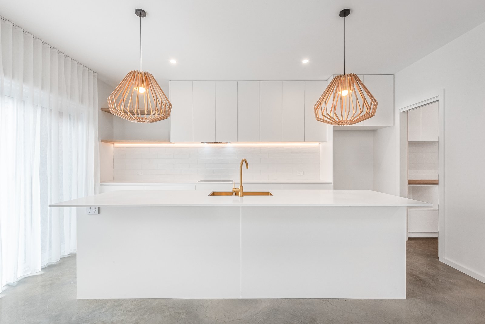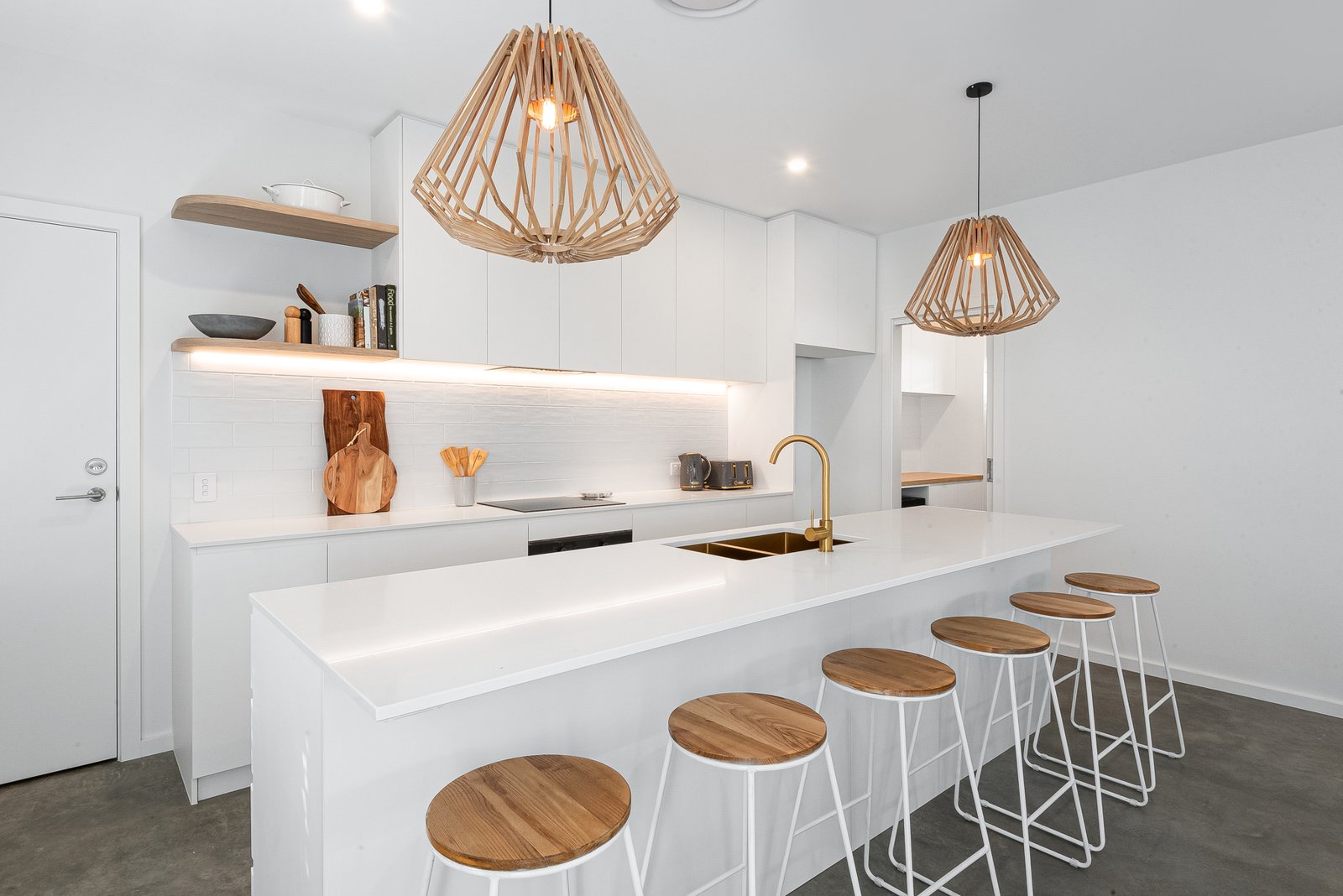 Kitchen: Luxury stone benchtops with overhanging breakfast bar, pendant lighting, induction cooktop, electric oven, and a combined laundry and Butler’s pantry.