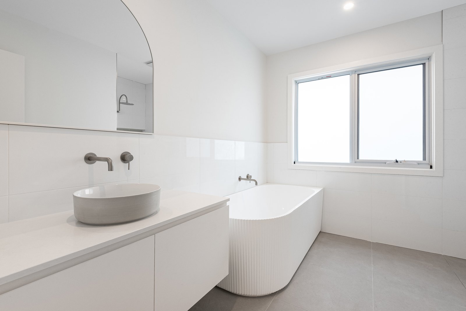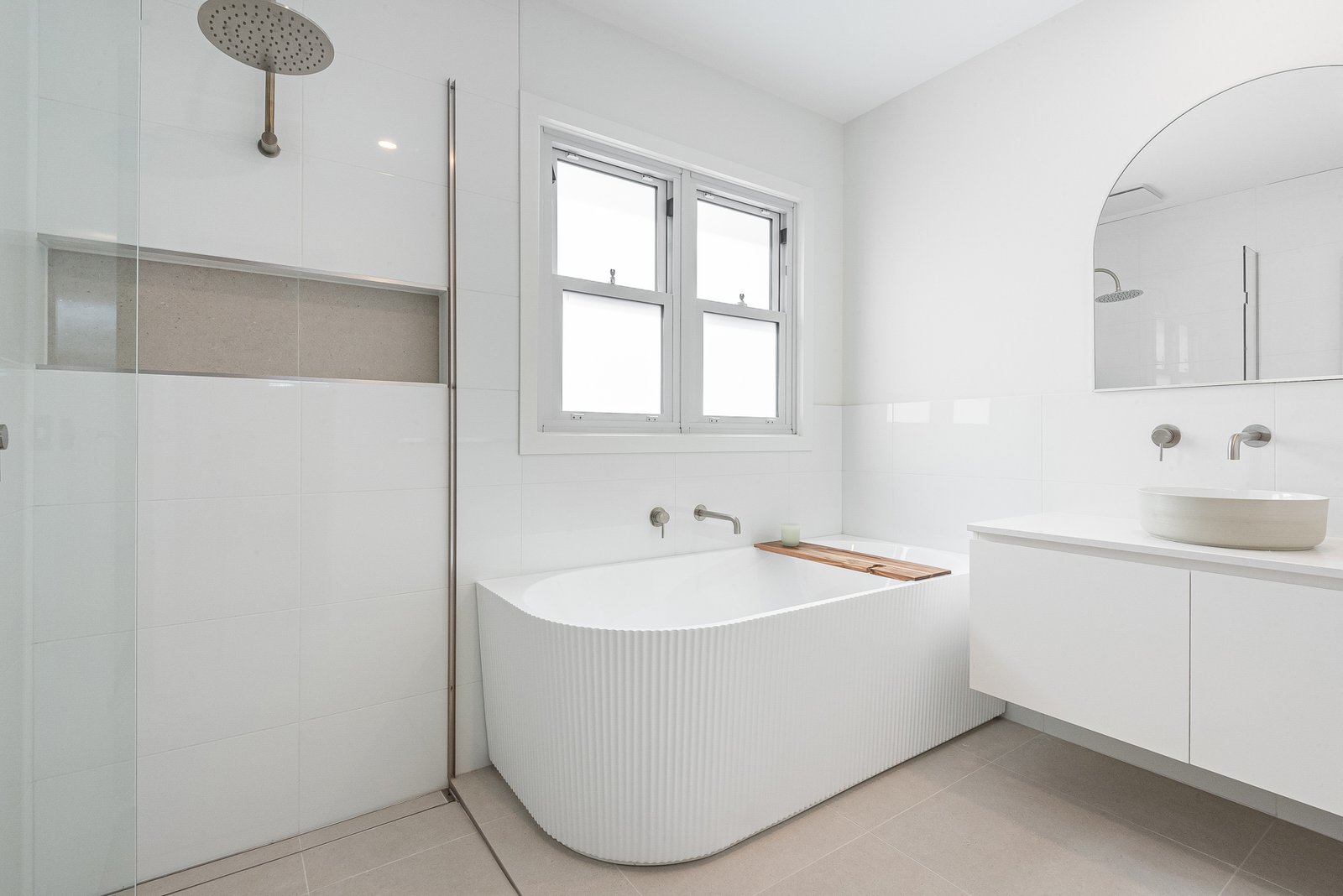 Main Bathroom: Stunning ribbed bathtub, walk-in shower, vanity, and separate toilet.