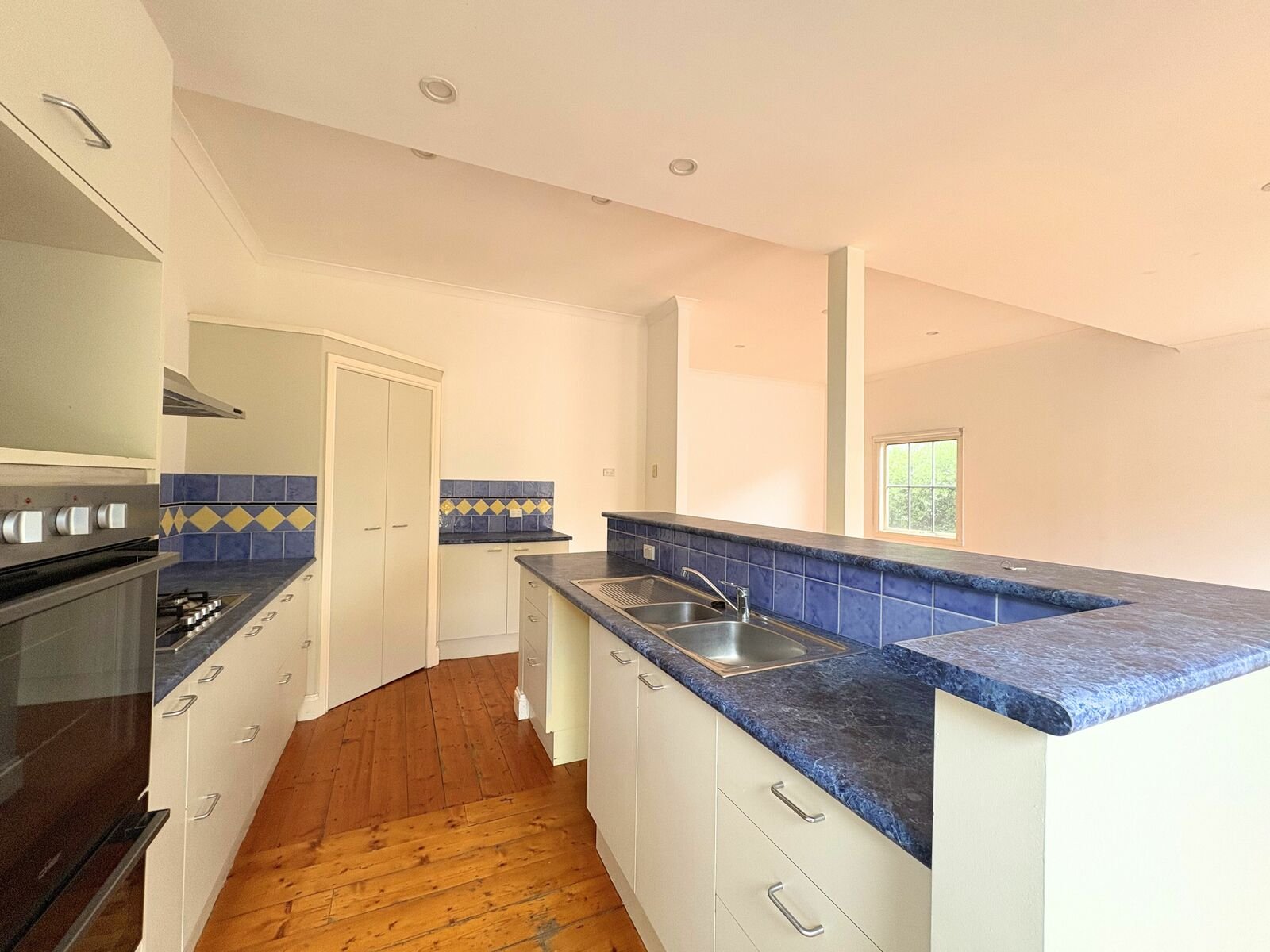 The generous open-plan living and dining area forms the heart of the home, flowing into a functional kitchen equipped with ample cabinetry, expansive benchtops, gas cooking, and a breakfast bar ideal for everyday dining or entertaining guests. A separate laundry area adds extra convenience with plenty of storage.