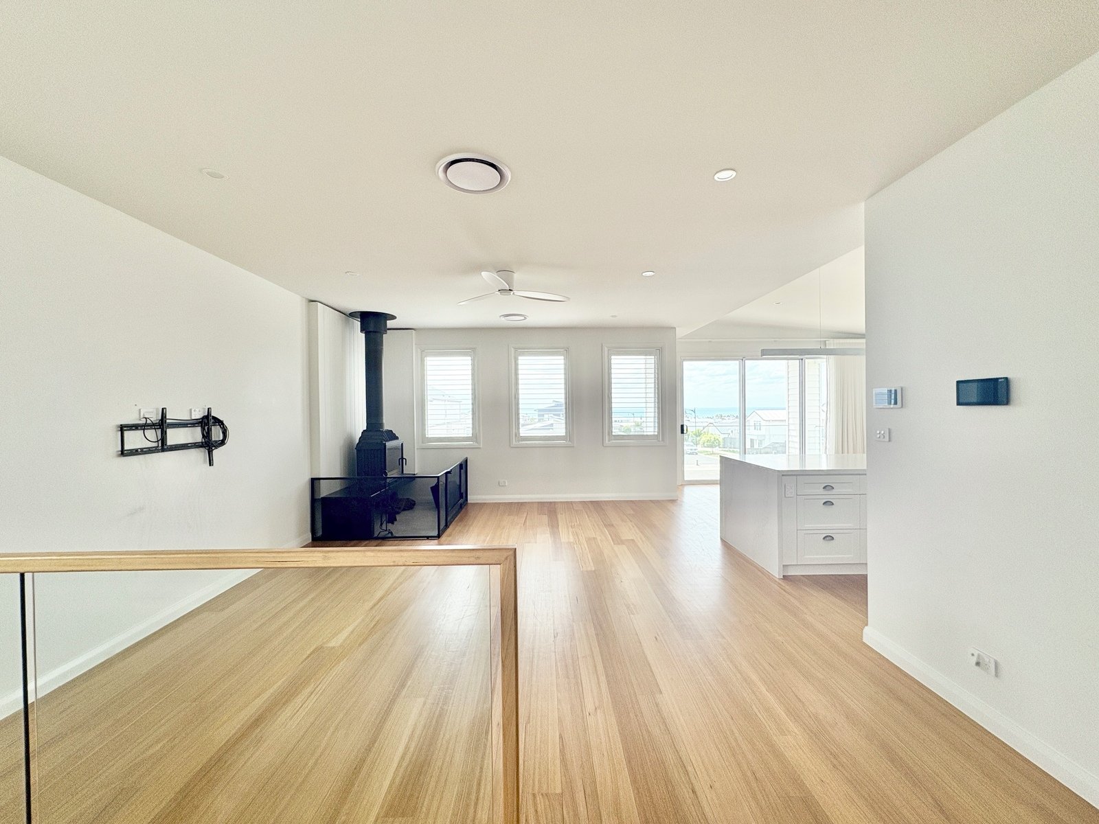 - Expansive open-plan living and dining zone with ceiling fan and fireplace, seamlessly flowing through sliding doors onto a private balcony