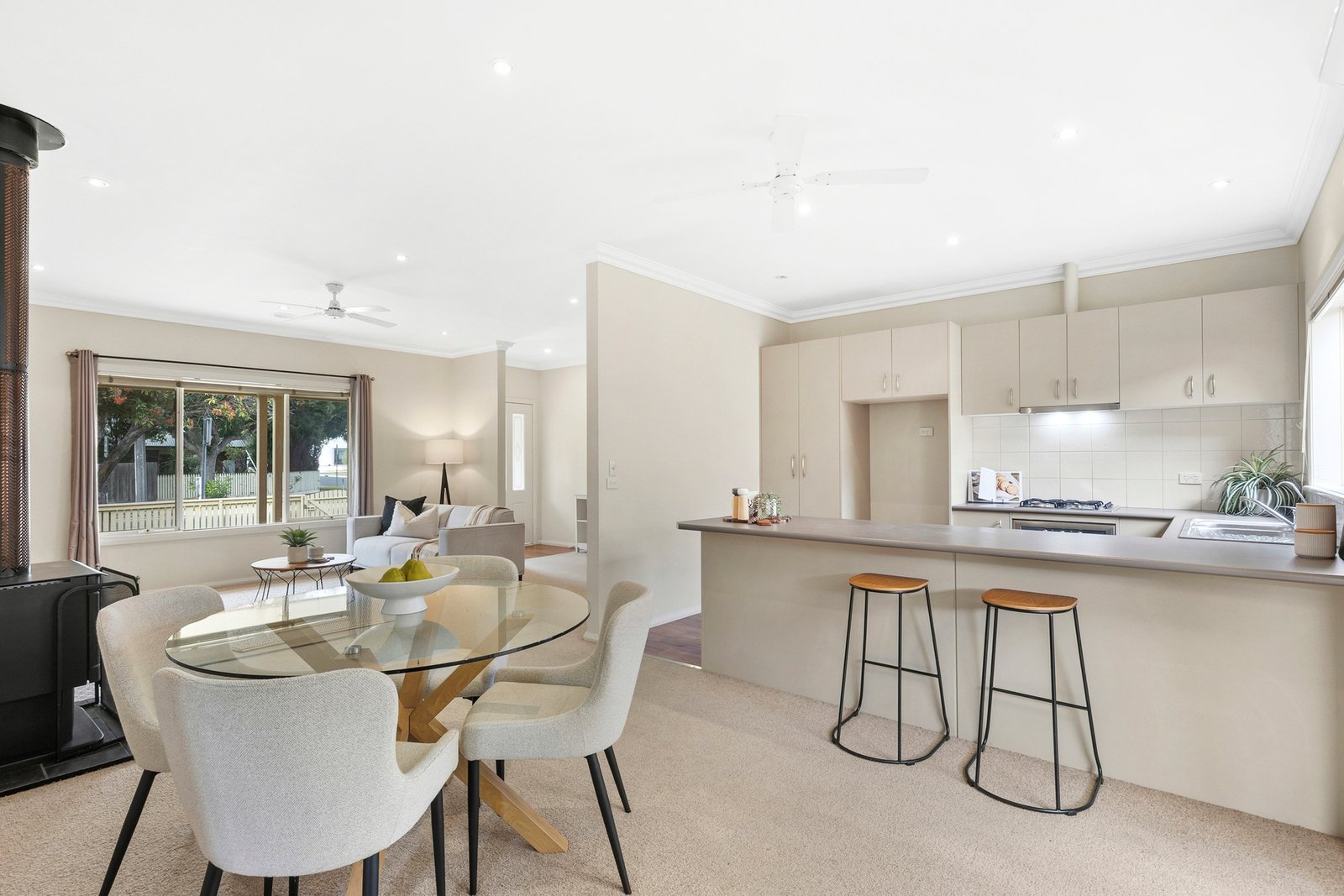 Behind its classic brick façade, the home reveals a warm and inviting interior defined by natural light, high ceilings and practical design. The open-plan living and dining domain forms the heart of the home, offering generous proportions and a comfortable layout suited to both everyday living and entertaining. The well-appointed kitchen features a 600mm oven and cooktop, tiled splashback, ample bench space and generous cabinetry.