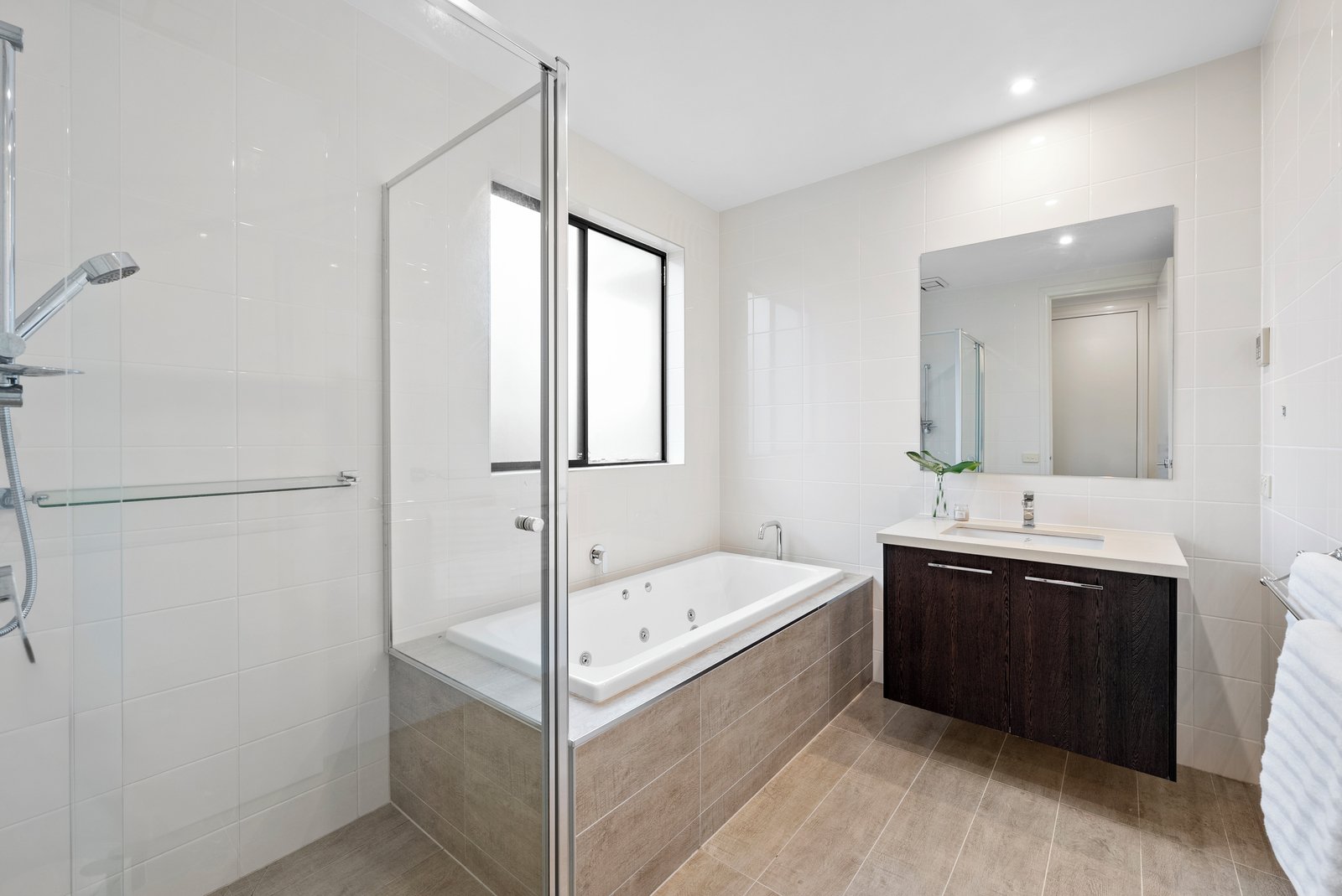 On the ground floor, a private bedroom with walk-in robe, sleek ensuite and direct garden connection provides the ideal master option for those seeking single-level ease, or independence for adult children, while a study enjoys leafy aspects.