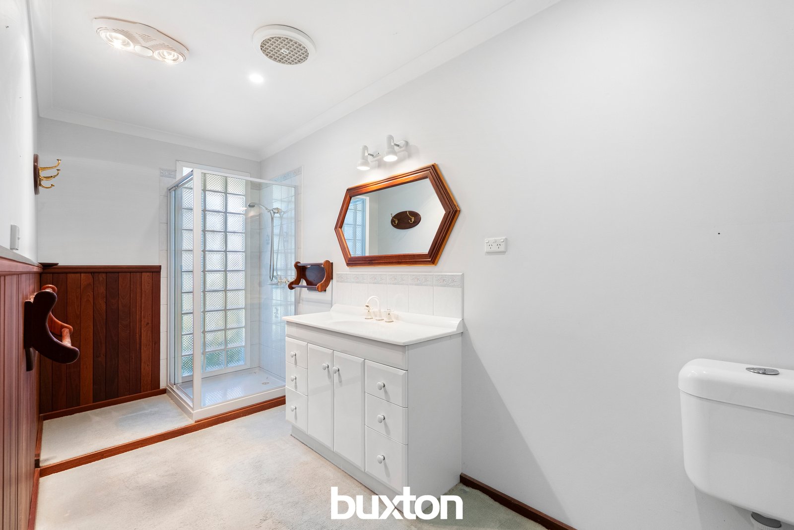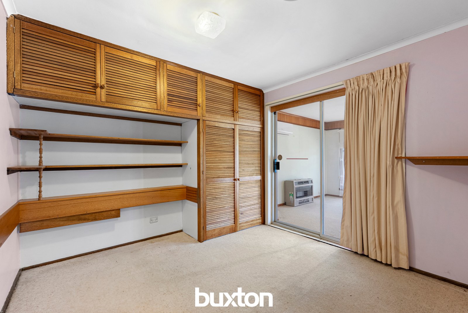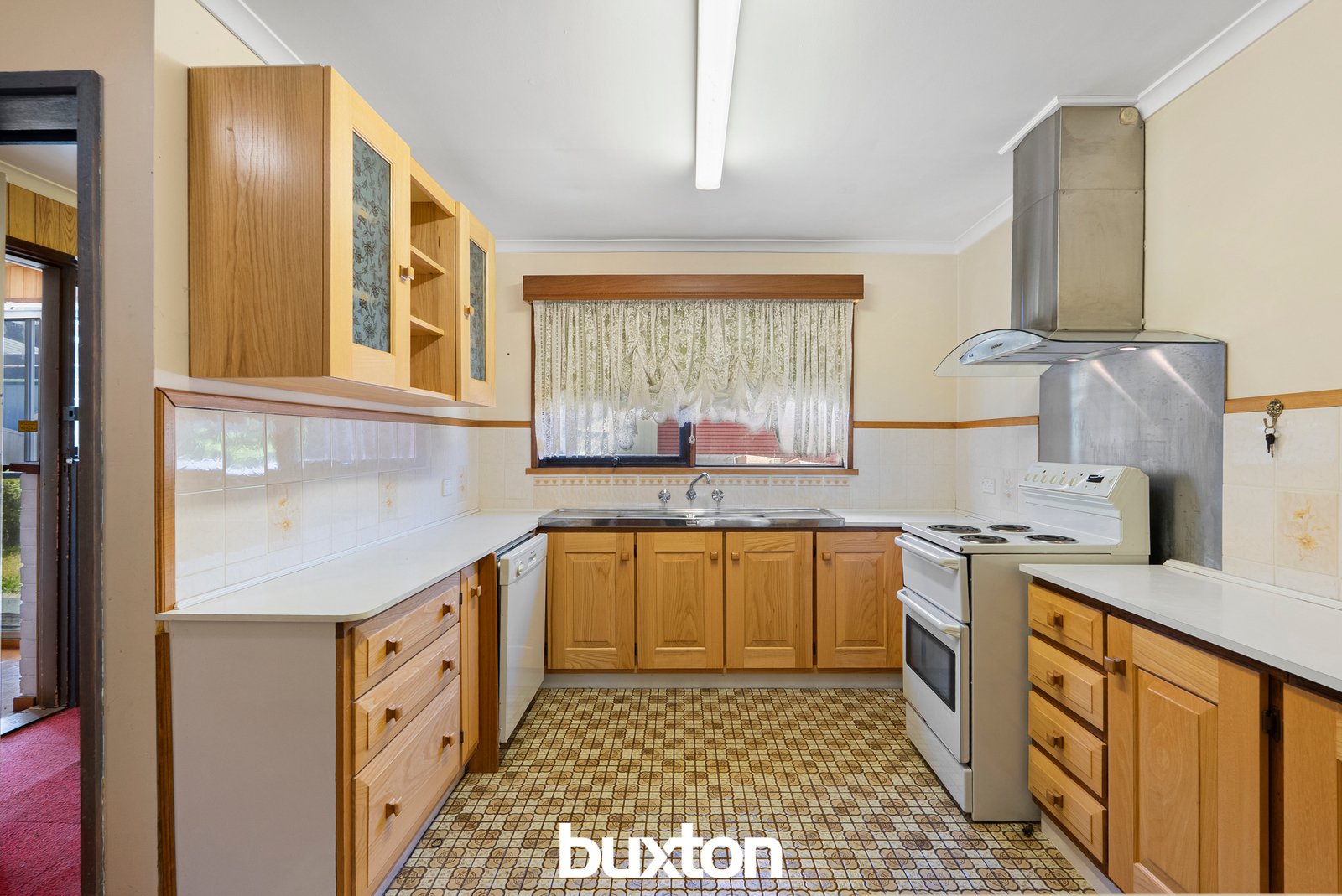 Centrally positioned and adjoining the dining area, the kitchen offers a practical and well-proportioned layout featuring white laminate benchtops, original timber-look cabinetry with select glass-fronted upper units, and a freestanding electric stove complemented by a stainless steel range hood. Direct access to the covered patio enhances everyday functionality and creates an easy connection between indoor and outdoor spaces.