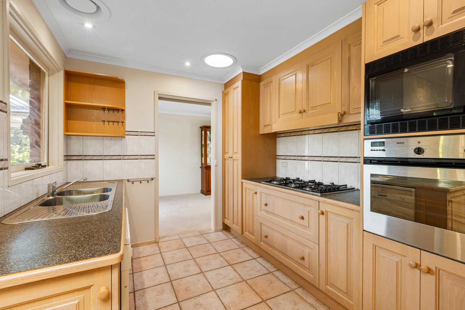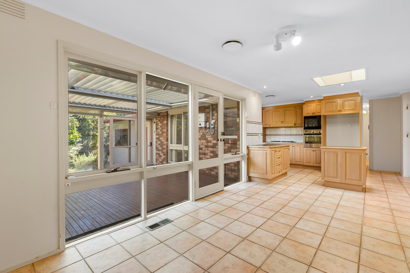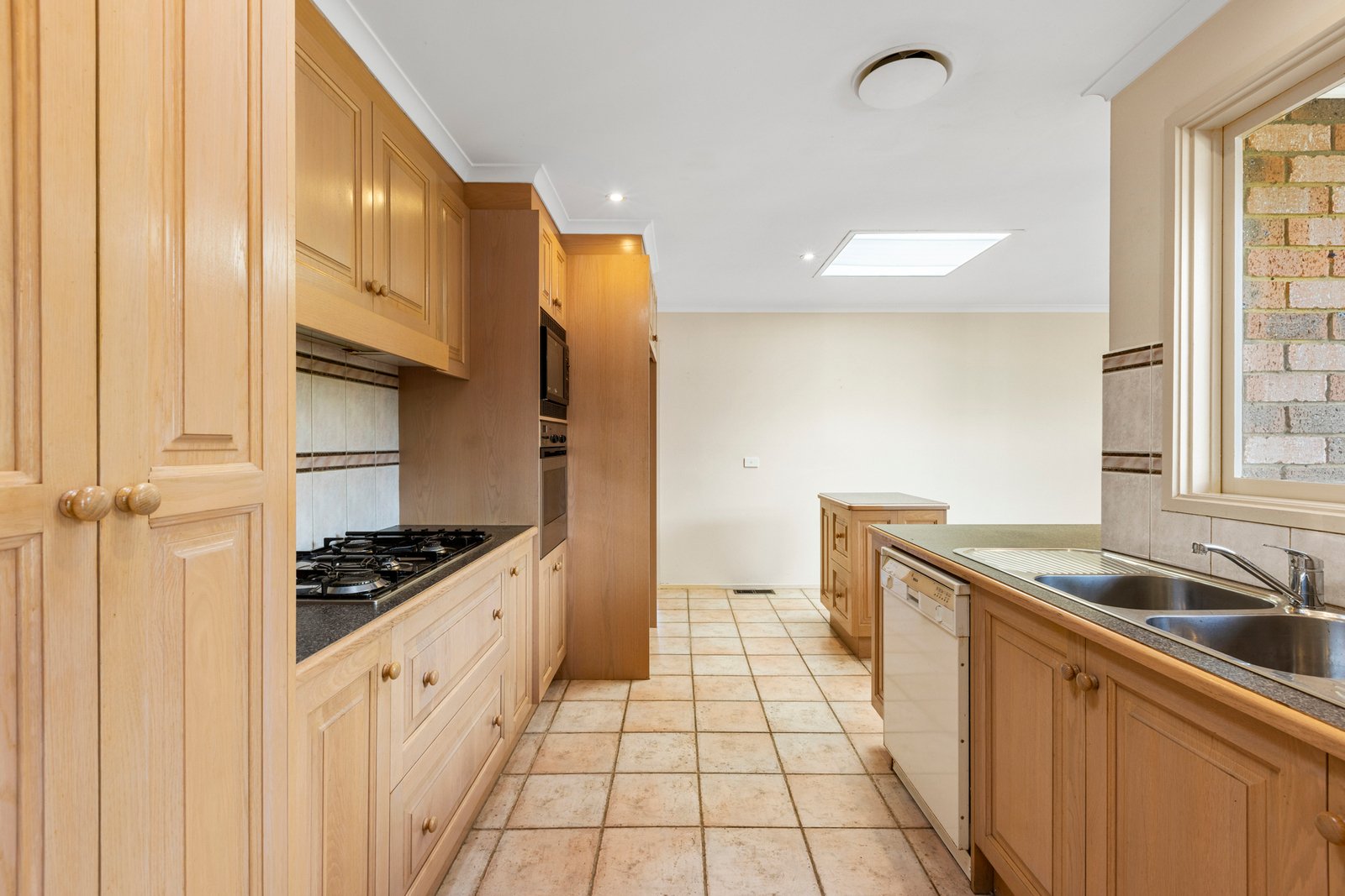 Inside, the home offers a warm and inviting lounge, a well-appointed kitchen with an island bench plus an additional preparation bench, gas cooktop, and dishwasher. Skylights fill the dining area with natural light, creating a bright and welcoming space for family meals.