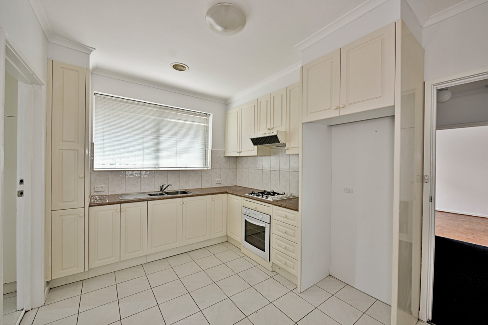 The spacious living/dining area seamlessly flows into a well-appointed kitchen, featuring a gas cooktop, oven, and ample cupboard space—ideal for cooking and entertaining. Both bedrooms come with built-in wardrobes, while the sleek central bathroom provides modern appeal.