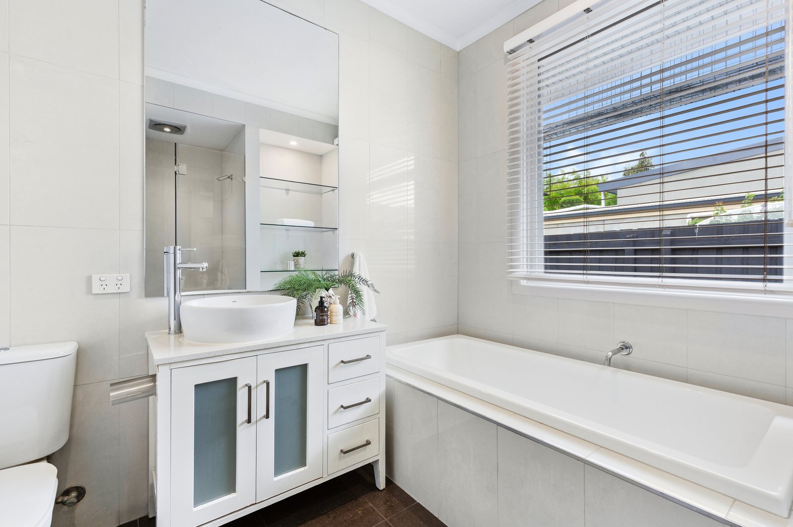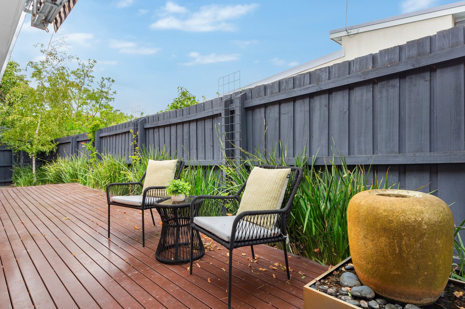 The bedrooms are exceptionally spacious, with the main suite featuring a full wall of built-in robes and its own leafy terrace, perfect for quiet mornings in the sun. A spa-inspired bathroom showcases a floating vanity, pebble floor shower and deep soaking bath, while the full sized laundry is equally well finished and offers direct outdoor access. Ducted heating, air conditioning and secure off-street parking with a remote single plus garage finalise the package.