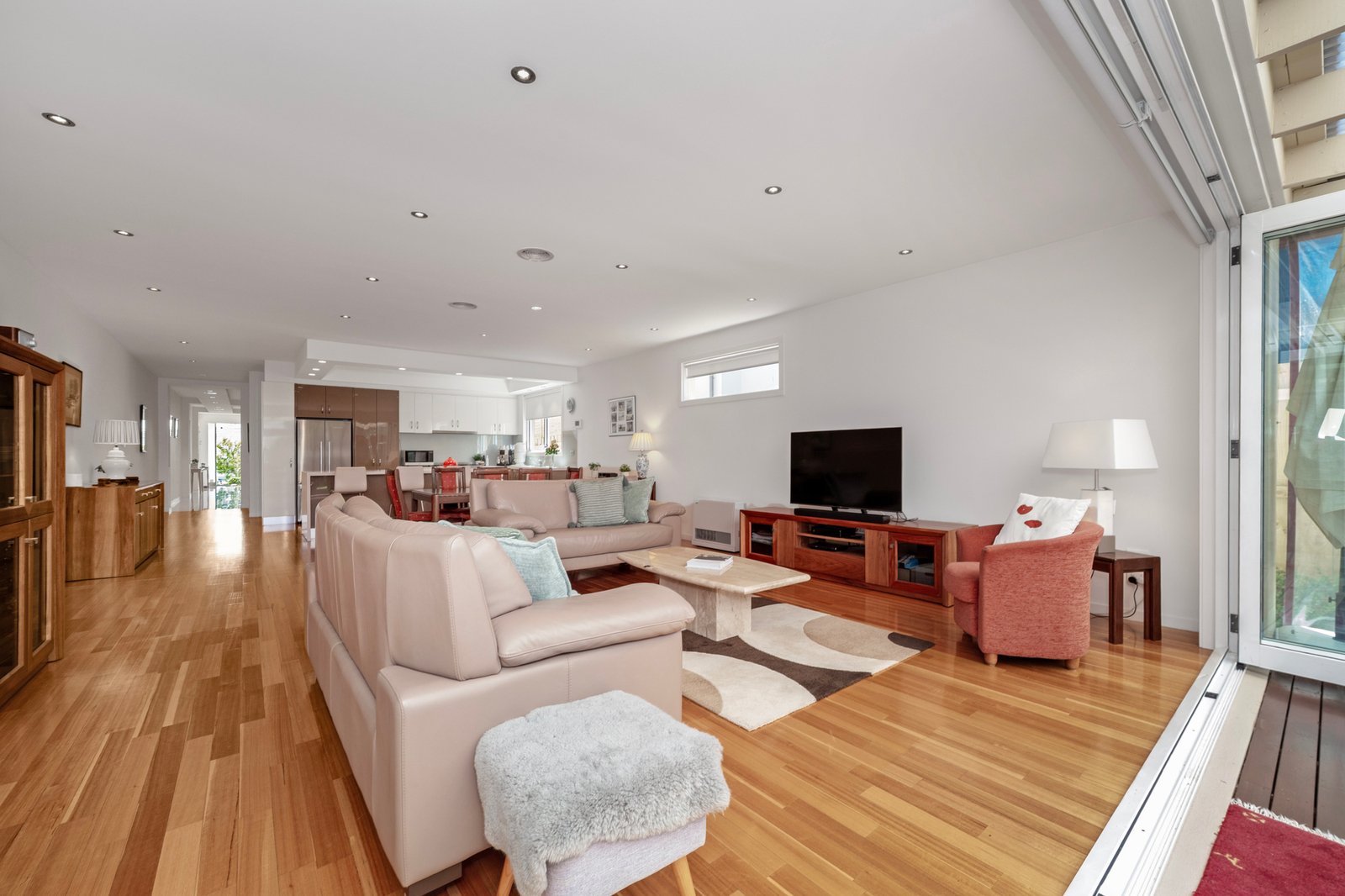 Upon entry, a wide, light-filled hallway immediately sets the tone for the home’s scale and quality, drawing you through to one of the most expansive open-plan living and dining domains available in the area.