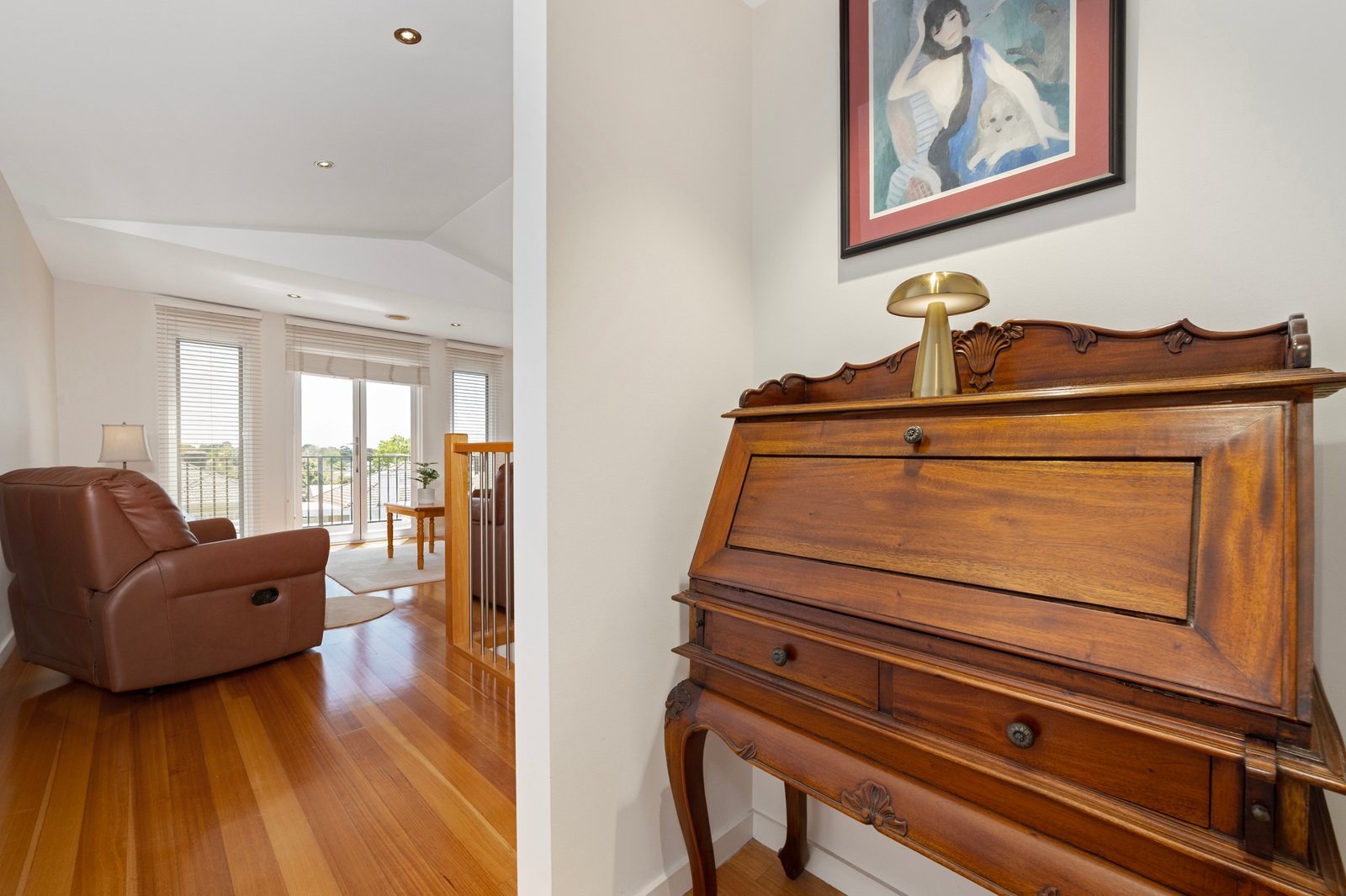 Upstairs, freshly painted interiors introduce a serene accommodation level designed for comfort and privacy. The master bedroom features soaring ceilings, a walk-in robe, and a private ensuite, while two additional bedrooms are serviced by stylish bathrooms with floor-to-ceiling tiles that emphasise craftsmanship and quality. A sun-drenched retreat opens onto a charming balcony capturing wonderful views—an inviting spot for morning coffee or evening unwinding. A dedicated study nook provides further functionality for students or professionals.