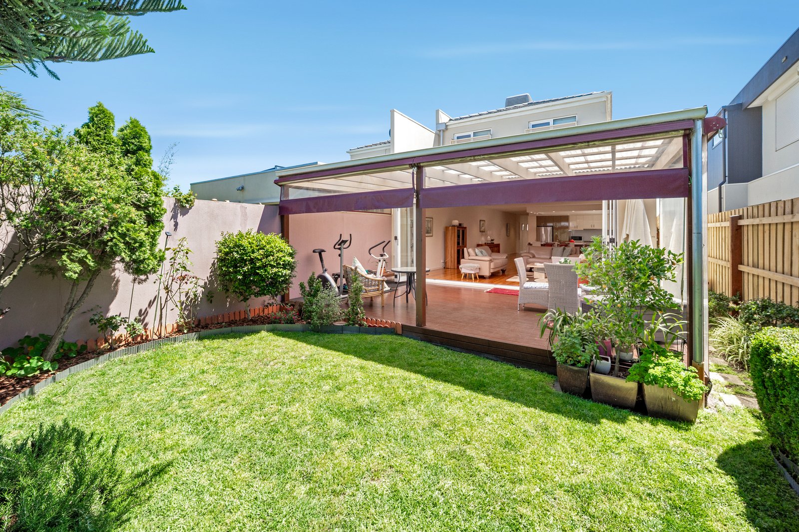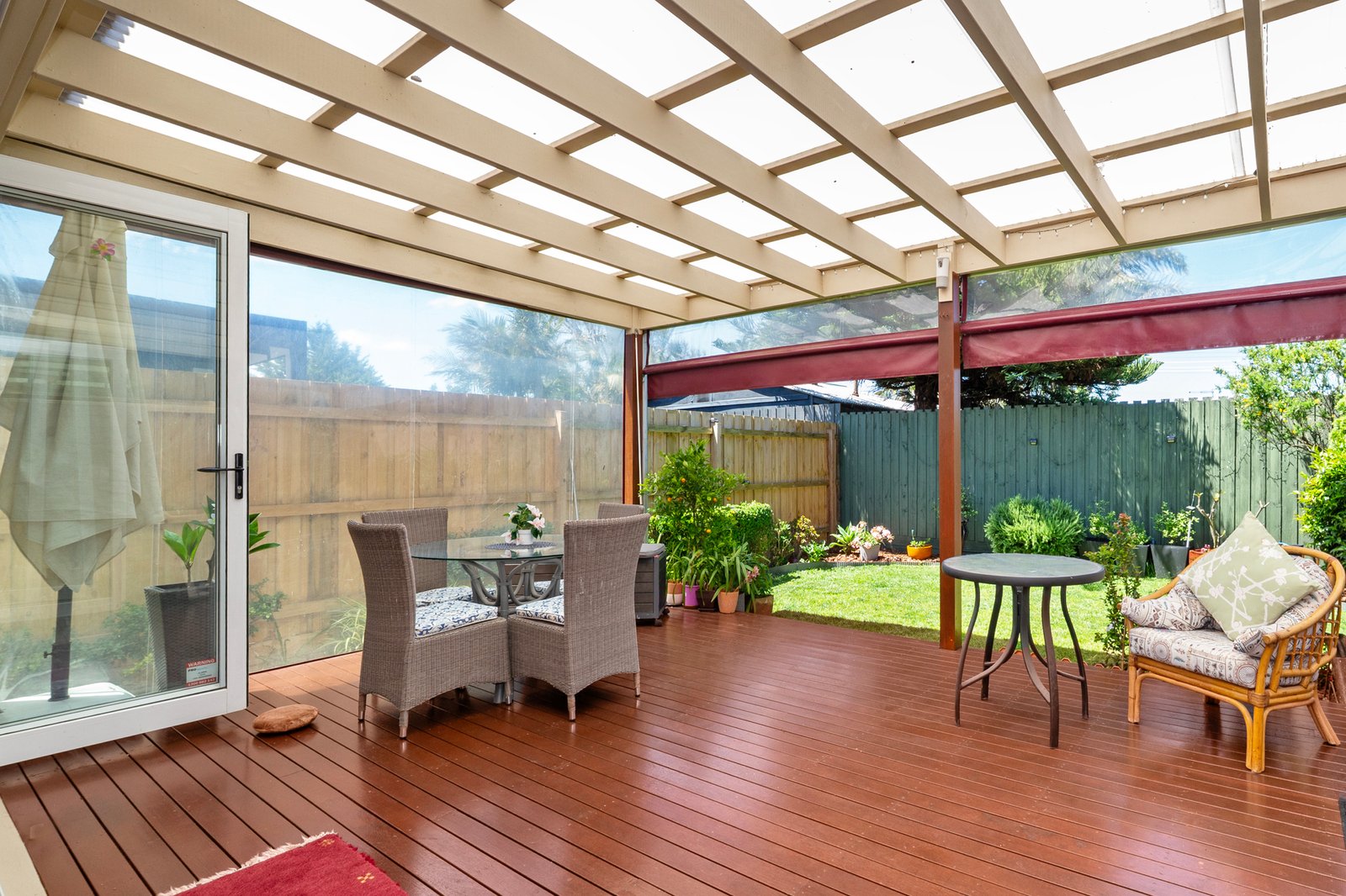 Designed for effortless entertaining, this inviting space seamlessly connects with a superb multi-seasonal alfresco deck via bi-fold doors with remote-controlled blinds. Fully enclosed with café blinds and framed by lush, easy-care gardens, this versatile outdoor zone functions as an additional living room all year round—perfect for gatherings, celebrations, or quiet moments of relaxation.
