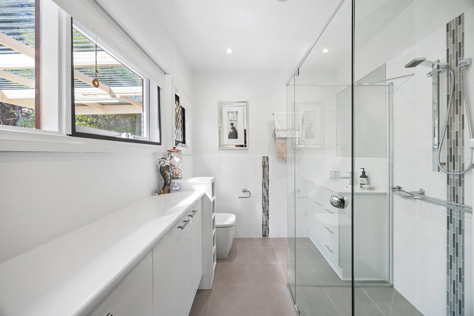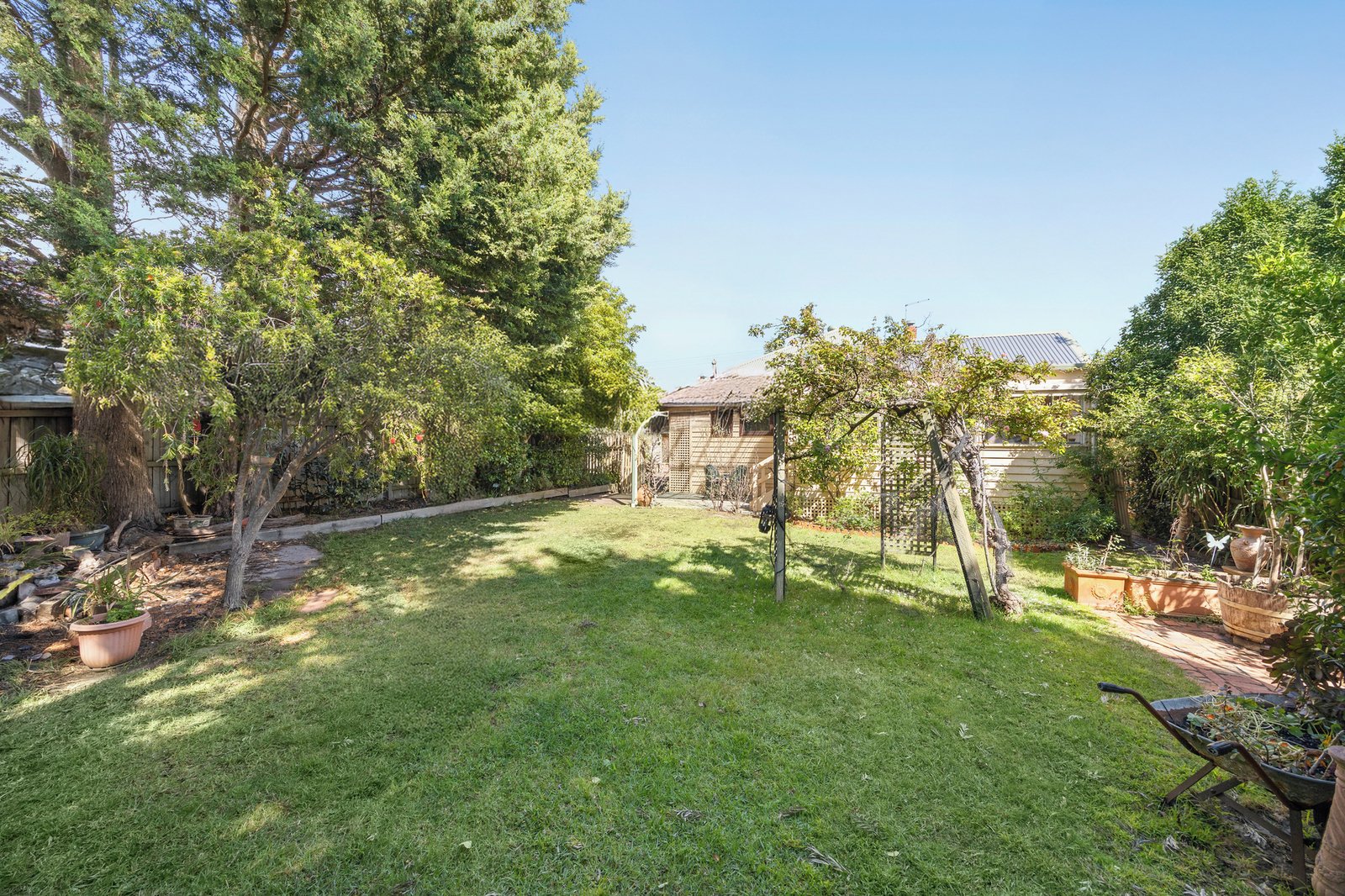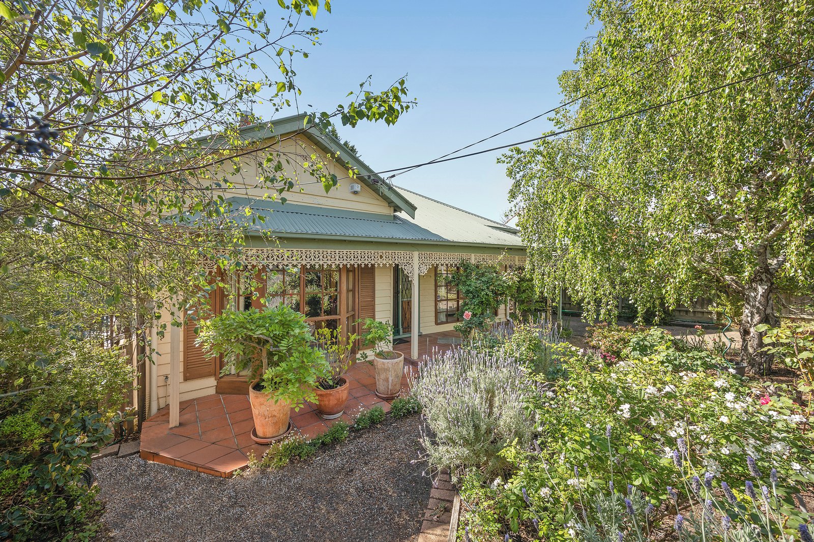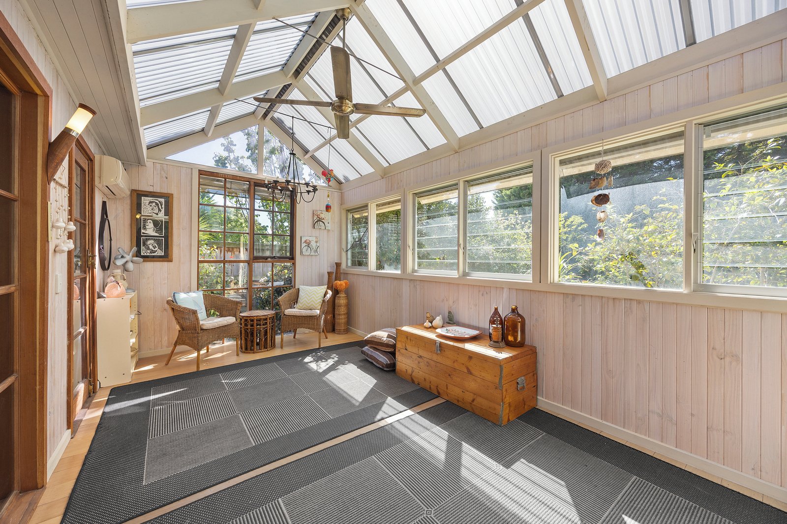Outdoors, enjoy an all-weather alfresco area surrounded by beautifully landscaped, established gardens with vine-draped greenery and mature trees — creating a private and picturesque setting perfect for entertaining or relaxing.