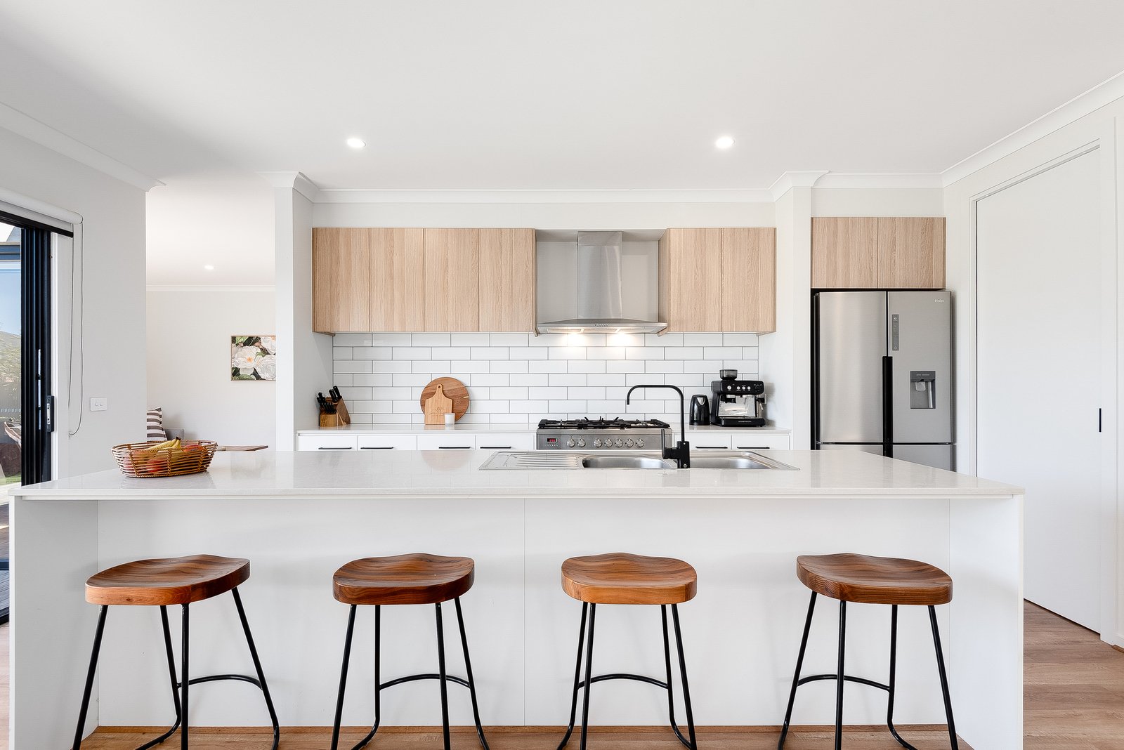 The main living area is a spacious open plan kitchen, dining and family room, connecting with the rear deck for seamless indoor-outdoor living and entertaining. The quality kitchen features stone benchtops, a 900mm oven and cooktop, dishwasher, classic subway tile splashback, sleek cabinetry and a large walk-in pantry. An adjoining second living area offers a great space to retreat, or send the kids to play, also enjoying direct access to the deck.