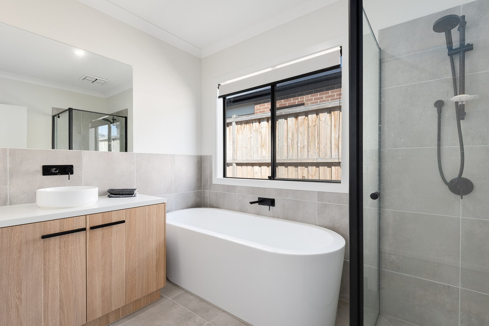 Set behind landscaped gardens, the coastal contemporary façade presents a stylish blend of timber and rendered finishes. Inside, a central hallway guides your eye through the length of the home, showcasing light interiors and modern flooring creating an inviting atmosphere throughout. Off the entry, the main bedroom features generous walk-in robes and a tastefully presented ensuite with double stone-topped vanity and chic black tapware. Two additional bedrooms are separately zoned, both include built-in robes, serviced by a stylish main bathroom with a beautiful freestanding bath.