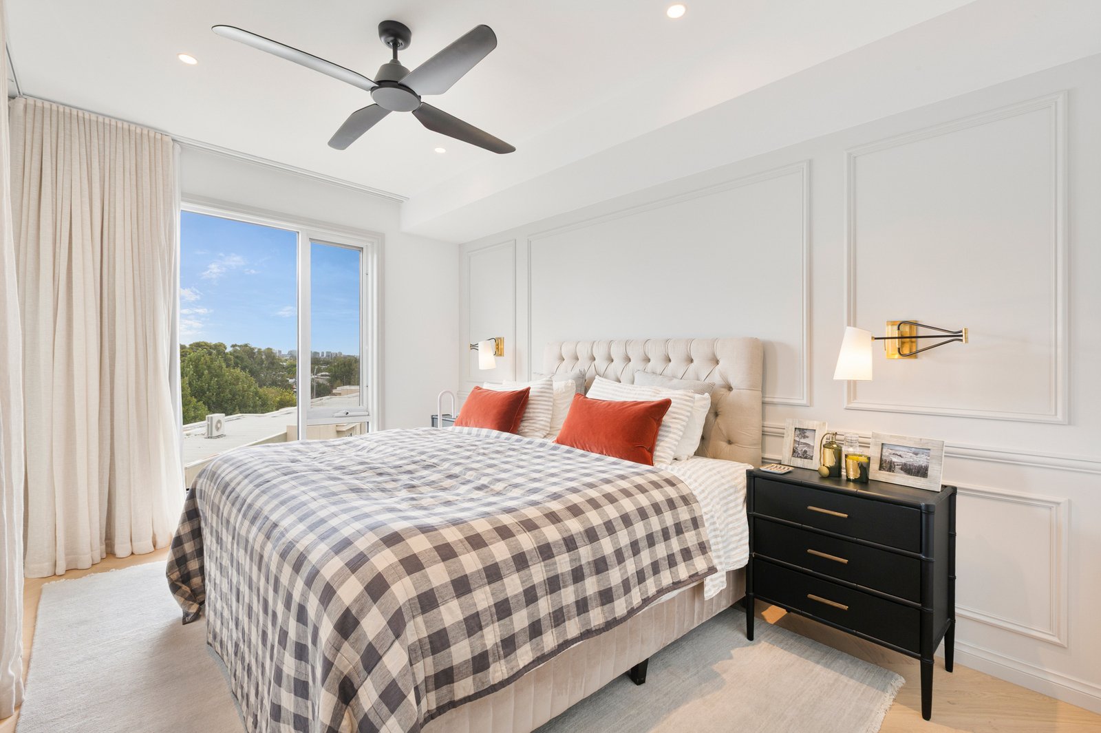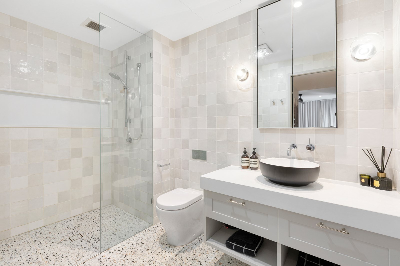 The main bedroom includes a walk-in robe and luxurious ensuite with terrazzo floors and bespoke cabinetry, while the second bedroom with built-in robes is serviced by a central bathroom of the same exacting standard, including laundry facilities.