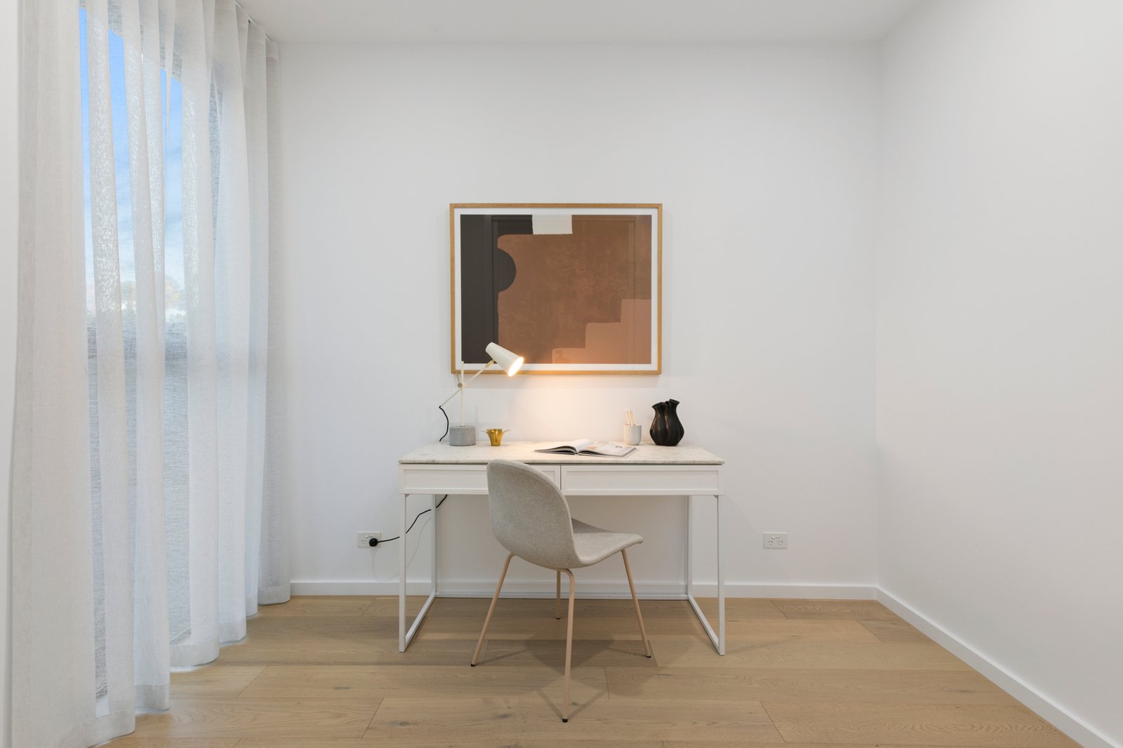 Double doors conceal an entry study area, creating a peaceful work-front home office space, while further on discover the first of a choice of two primary bedrooms with ensuites, a fully-tiled powder room and laundry with drying rack and storage.