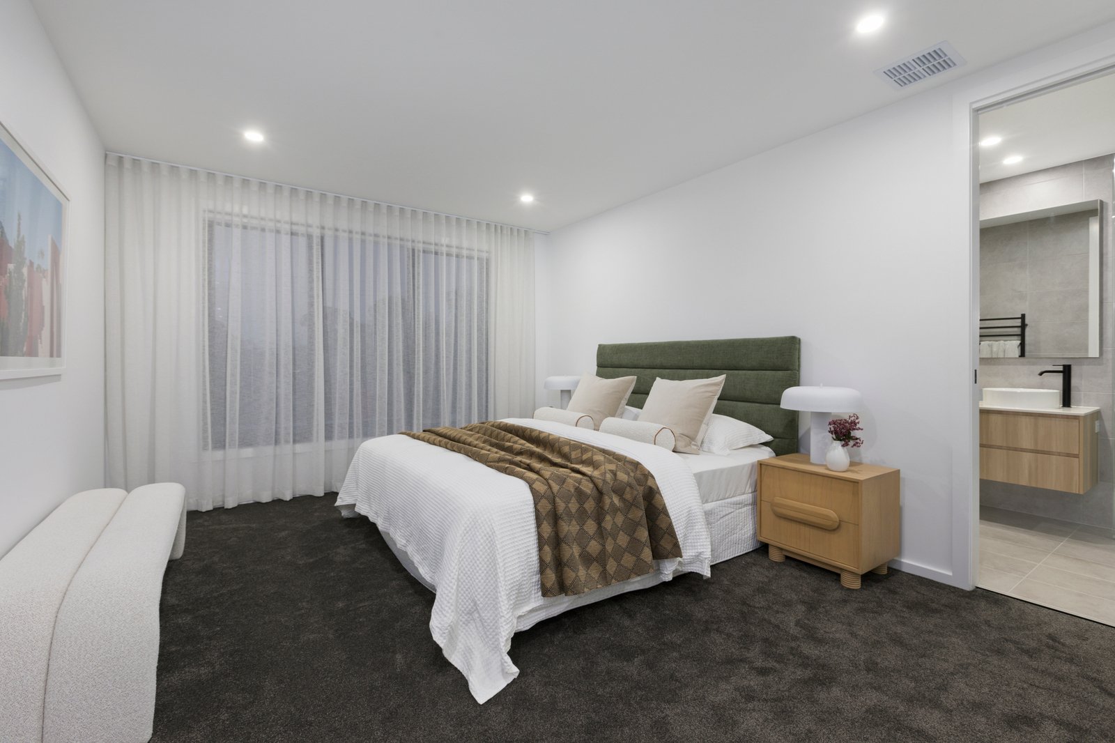 A floating staircase leads to the upstairs bedrooms and lounge area, allowing natural sunlight to cascade down below. The first-floor primary suite impresses with a walk-in robe while all bedrooms have the luxury of their own private ensuites. Ducted heating/cooling, security cameras and intercom entry are all offered, along with in-drawer power points & charging ports, a Billi tap and water/electricity provisions on the entertainer’s deck.