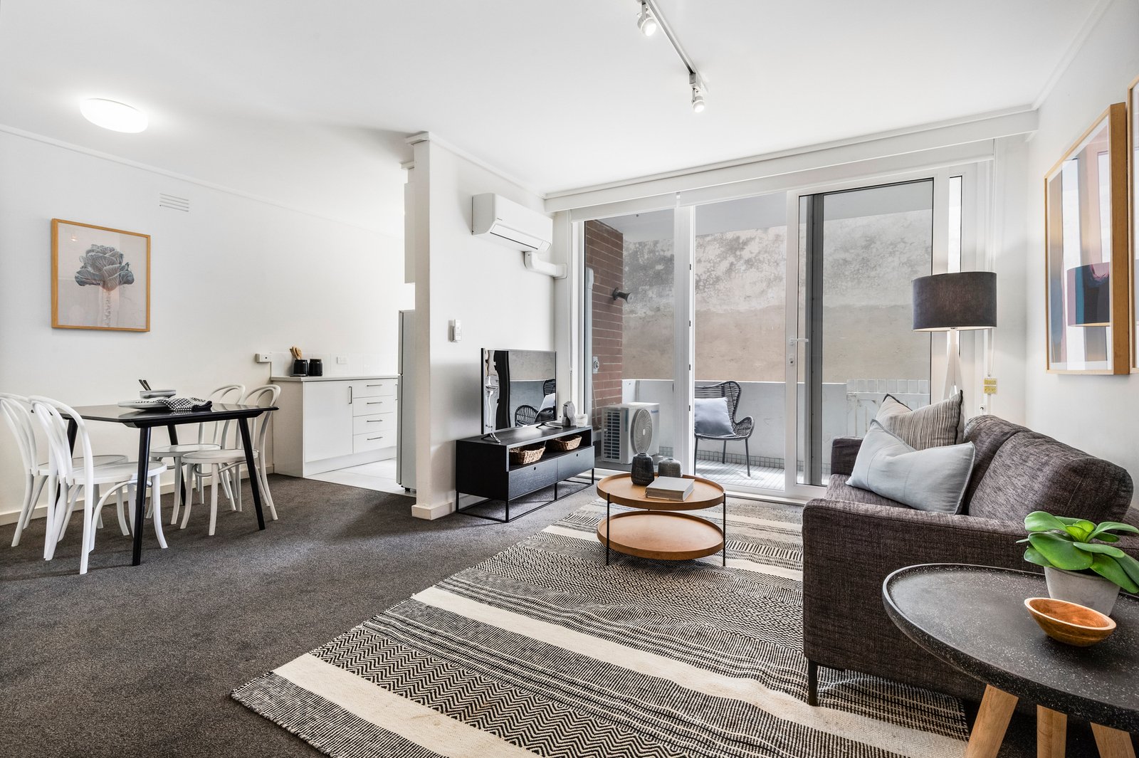 Generous open plan living and dining areas flow from an updated kitchen, creating a light-filled, versatile space. The bright bedroom features built-in robes and is serviced by a stylish bathroom with integrated laundry facilities.