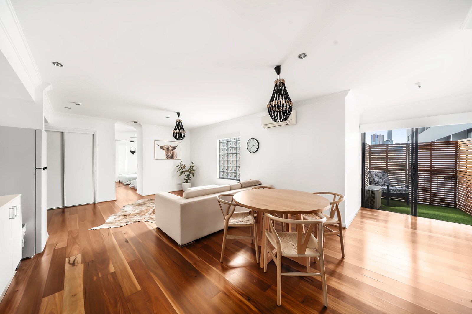 A spacious open-plan living and dining area flows seamlessly to a private balcony with a grassed area ideal for relaxing or entertaining. Additional features include split-system heating and cooling, secure basement parking, and a security intercom within a well-maintained complex