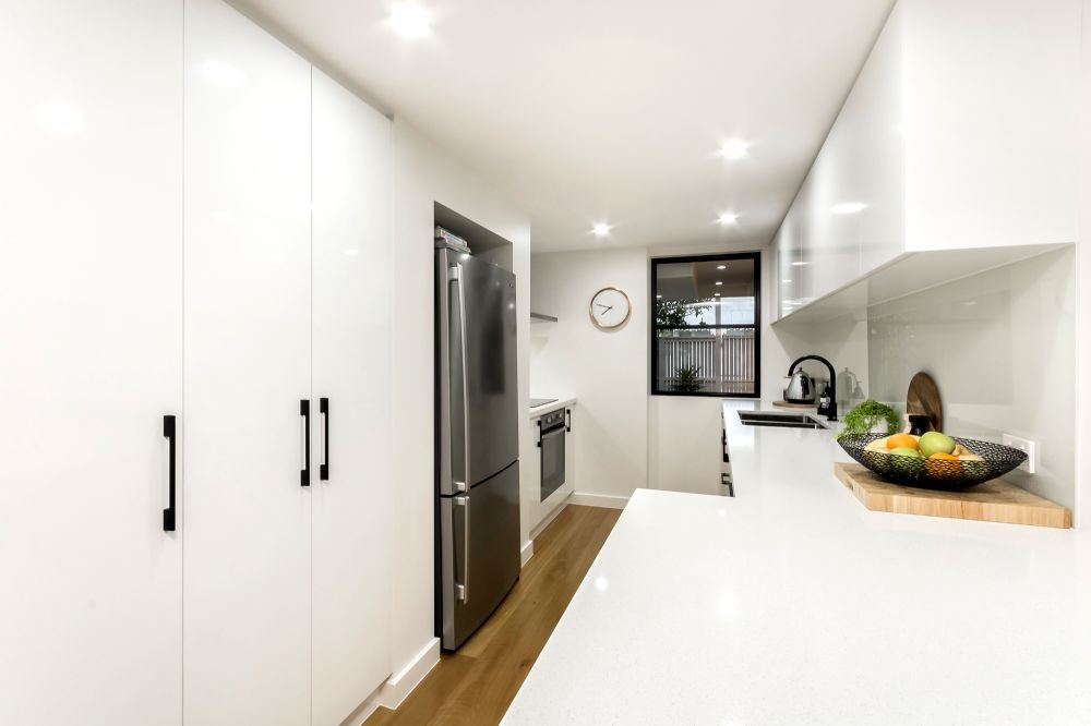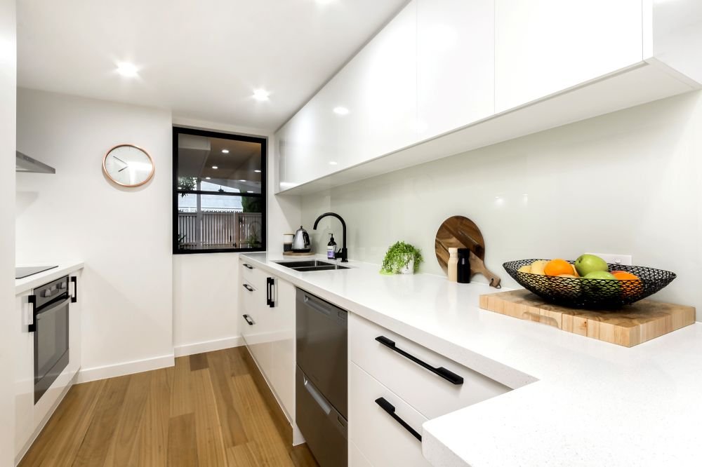 - Contemporary kitchen with stone benchtops, electric...