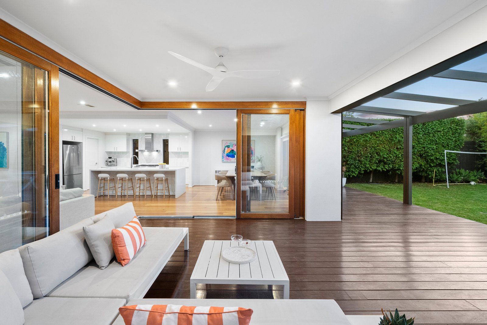 The north-west rear gardens deliver privacy and scale, with a wraparound deck comprising both covered entertaining and open al fresco areas, enhanced by automated retractable screens that transform the deck into a flexible, enclosed outdoor room for year-round enjoyment, while broad lawns provide space for play and a fire pit zone sets the scene for evenings spent under the stars.