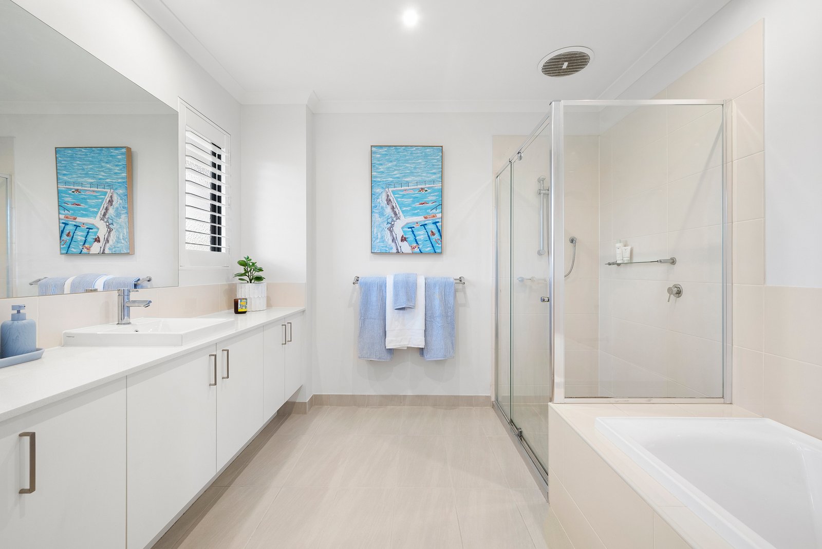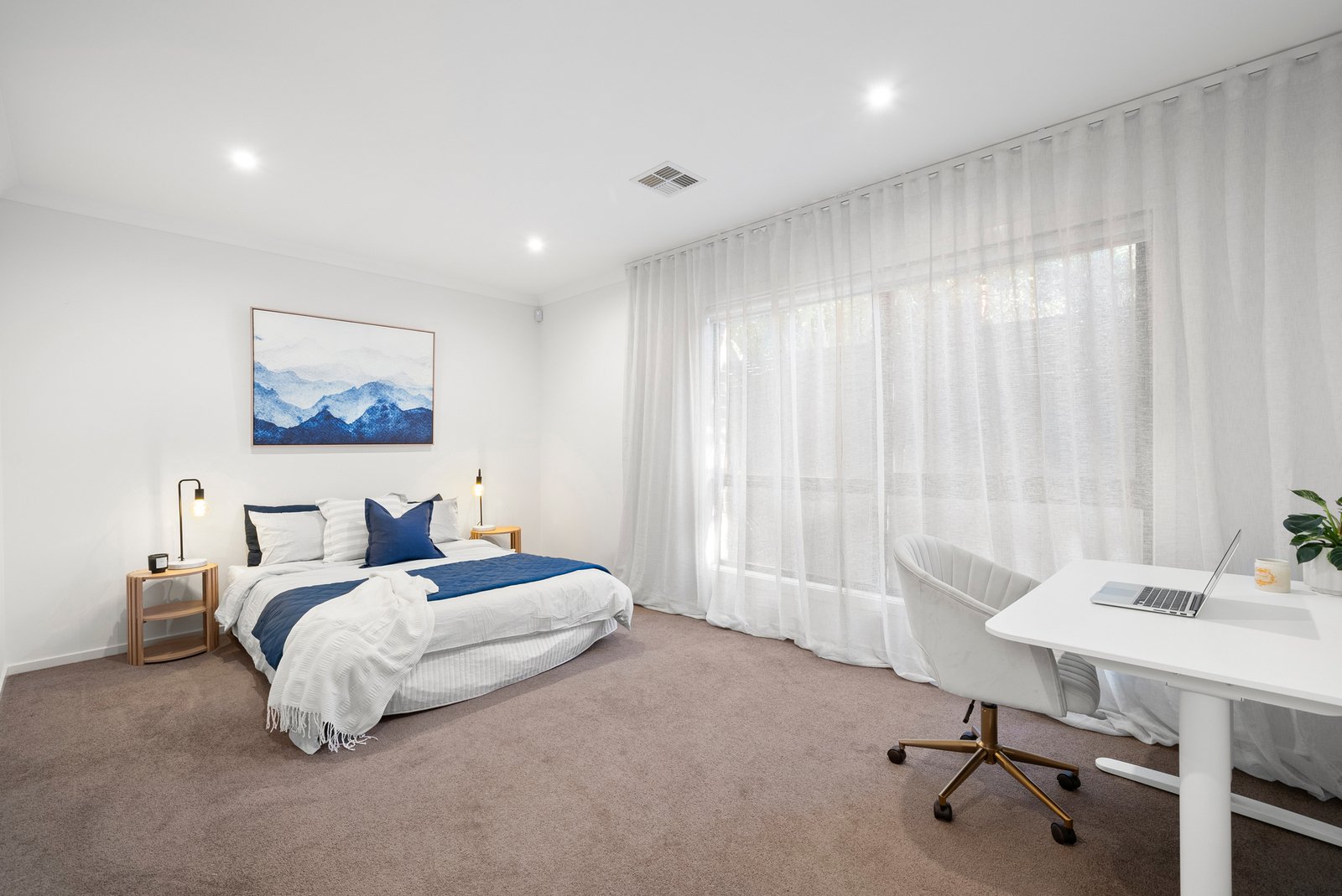 Accommodation is thoughtfully arranged across two levels. A ground floor bedroom offers flexibility, while upstairs a light-filled retreat with fitted study nook forms a central hub for the remaining four bedrooms. Zoned privately at the front, the indulgent main suite enjoys walk-in robes, a lavish twin-vanity ensuite with bath and separate shower, and a balcony capturing green outlooks. Three additional bedrooms, each with robes, share a sleek family bathroom, again appointed with bath and separate shower.