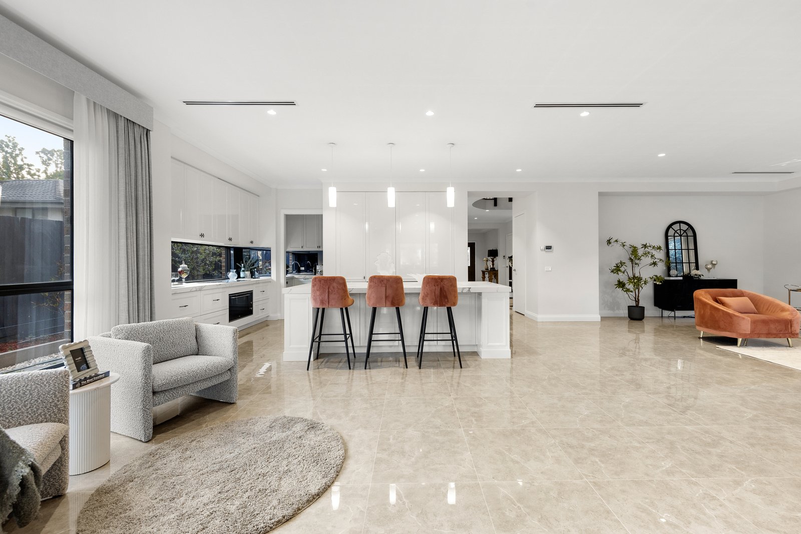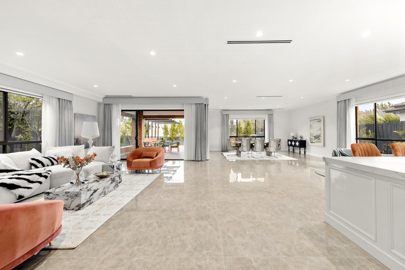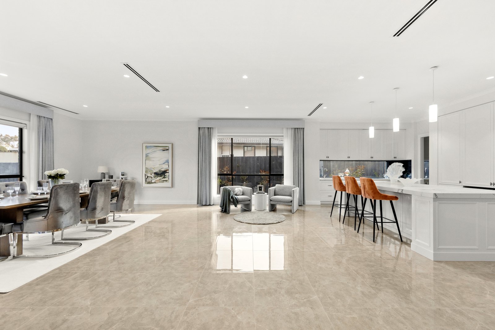 The open-plan living and dining areas flow seamlessly to a covered alfresco terrace,...