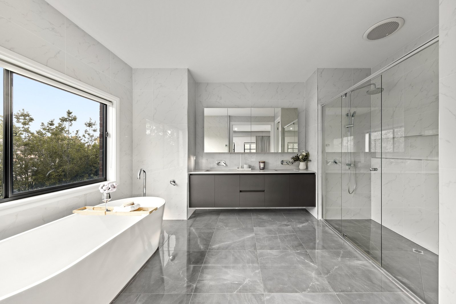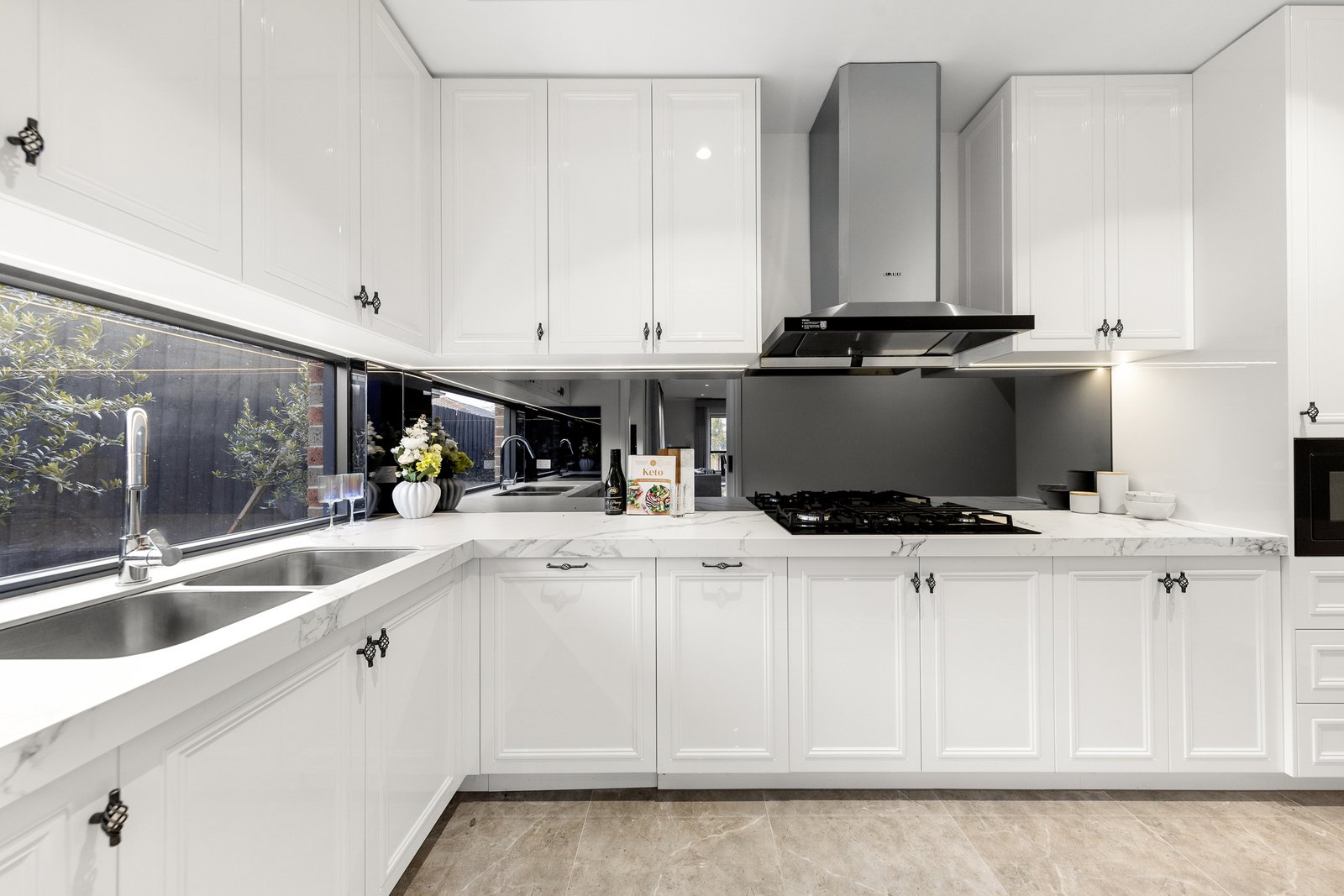 Culinary excellence is ensured with a dual-kitchen layout: the main kitchen boasts premium European appliances and marble benchtops, while a second kitchen caters to elaborate banquets or traditional wok cooking. A temperature-controlled wine cellar and bespoke storage add both functionality and style.