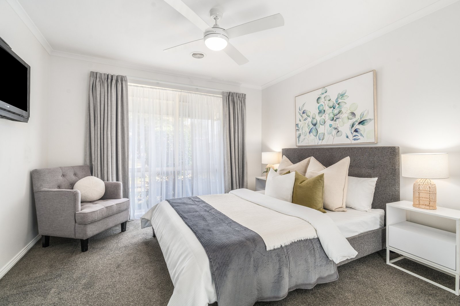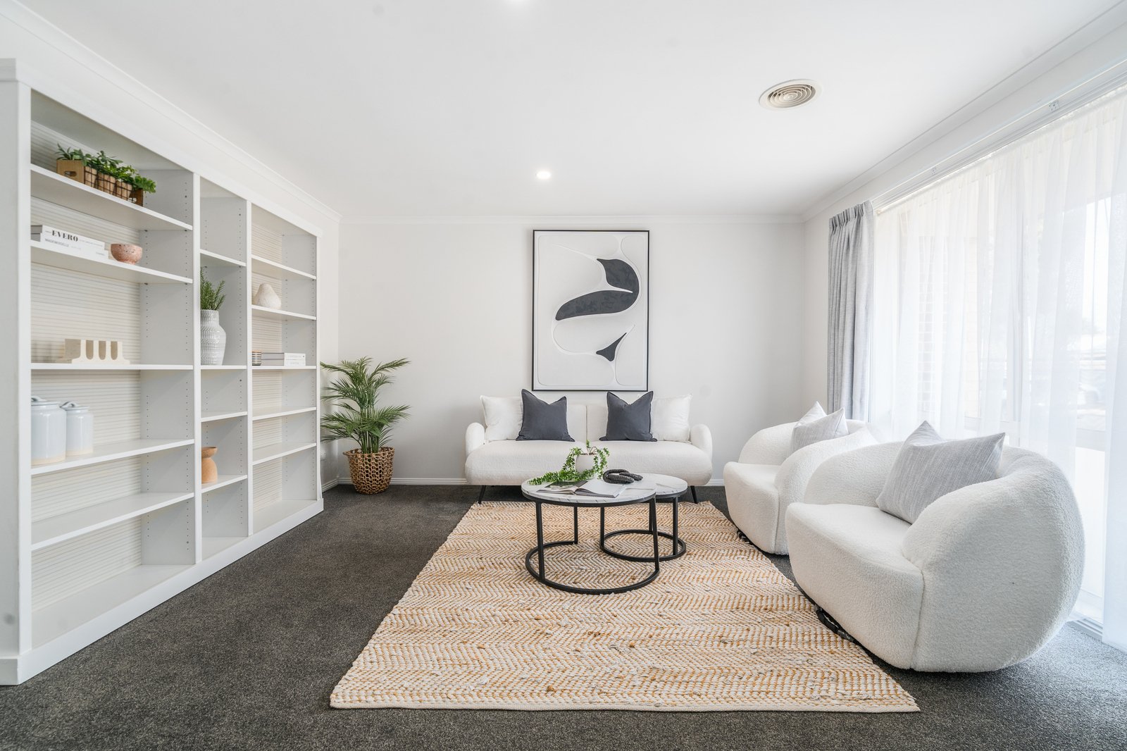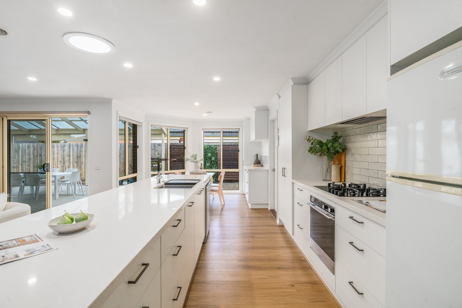 At the heart of the home, the beautiful kitchen is finished with striking 40mm stone benchtops and a sleek gas on glass cooktop, complemented by hybrid flooring through the main living areas and plush carpet in the bedrooms and front lounge.