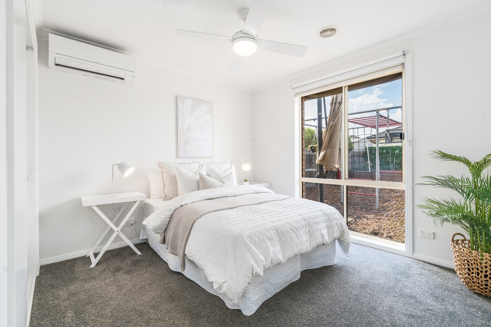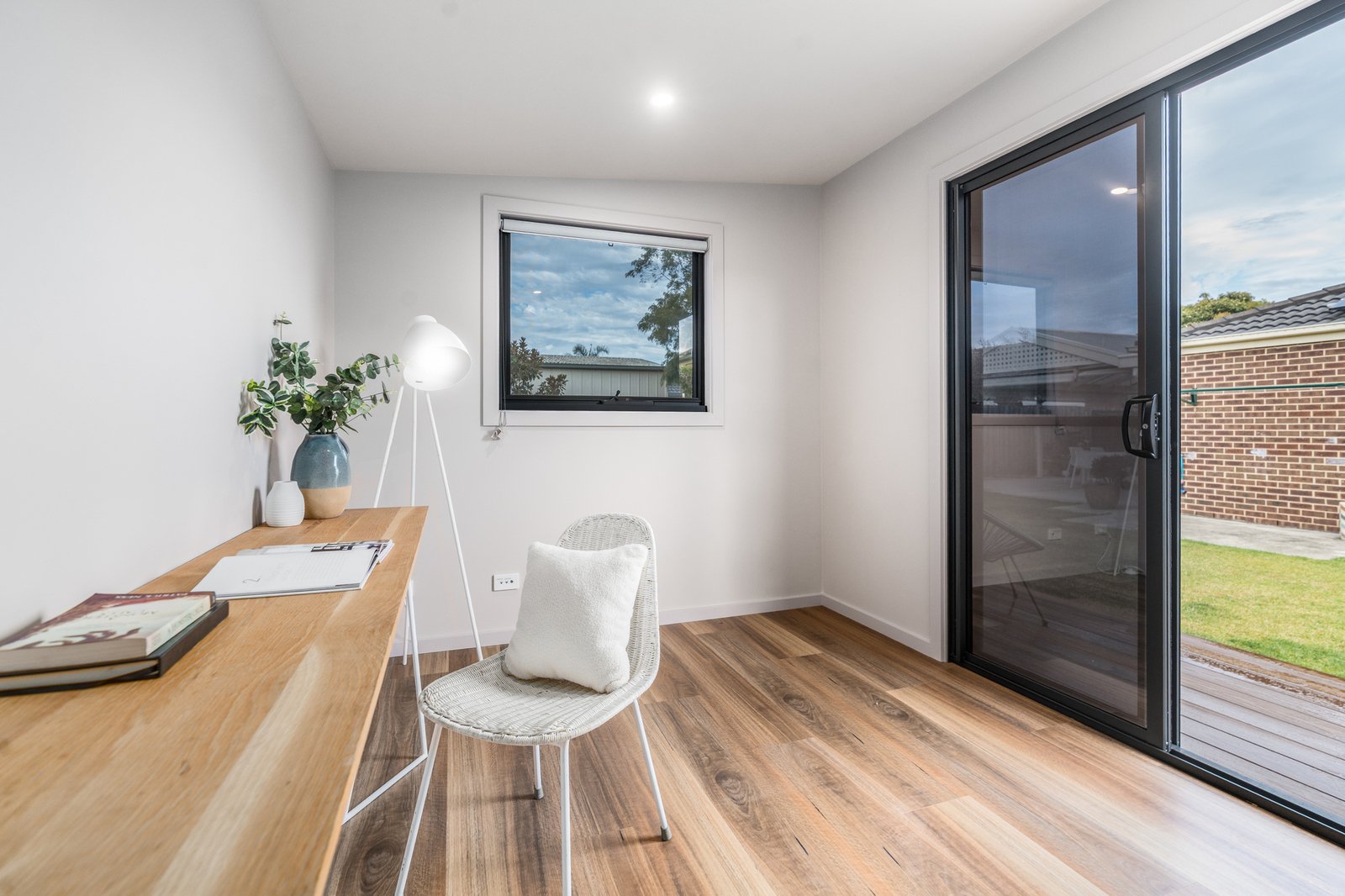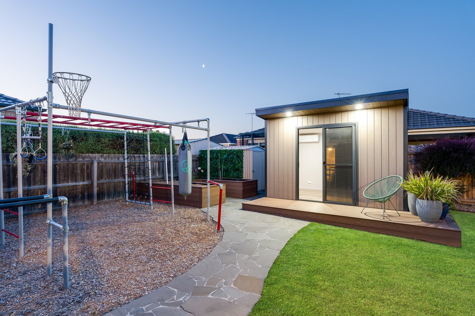 Outdoors, a large undercover alfresco overlooks the north-facing, fully landscaped backyard complete with bluestone pathways, raised veggie boxes, garden shed and an external pet enclosure. A standout feature is the fully serviced backyard office pod (approximately 9.8m²), equipped with hardwired power, internet connections, TV cabling and its own split system, creating the ideal work-from-home studio or creative retreat without the need for a building permit.