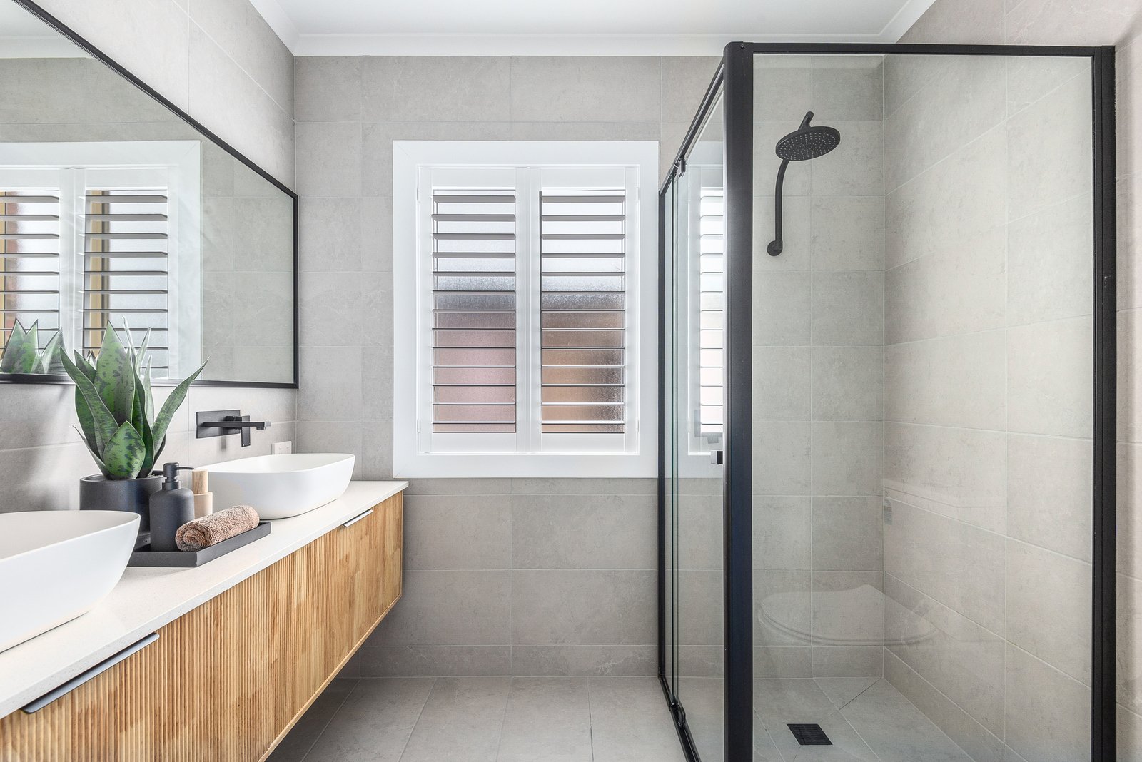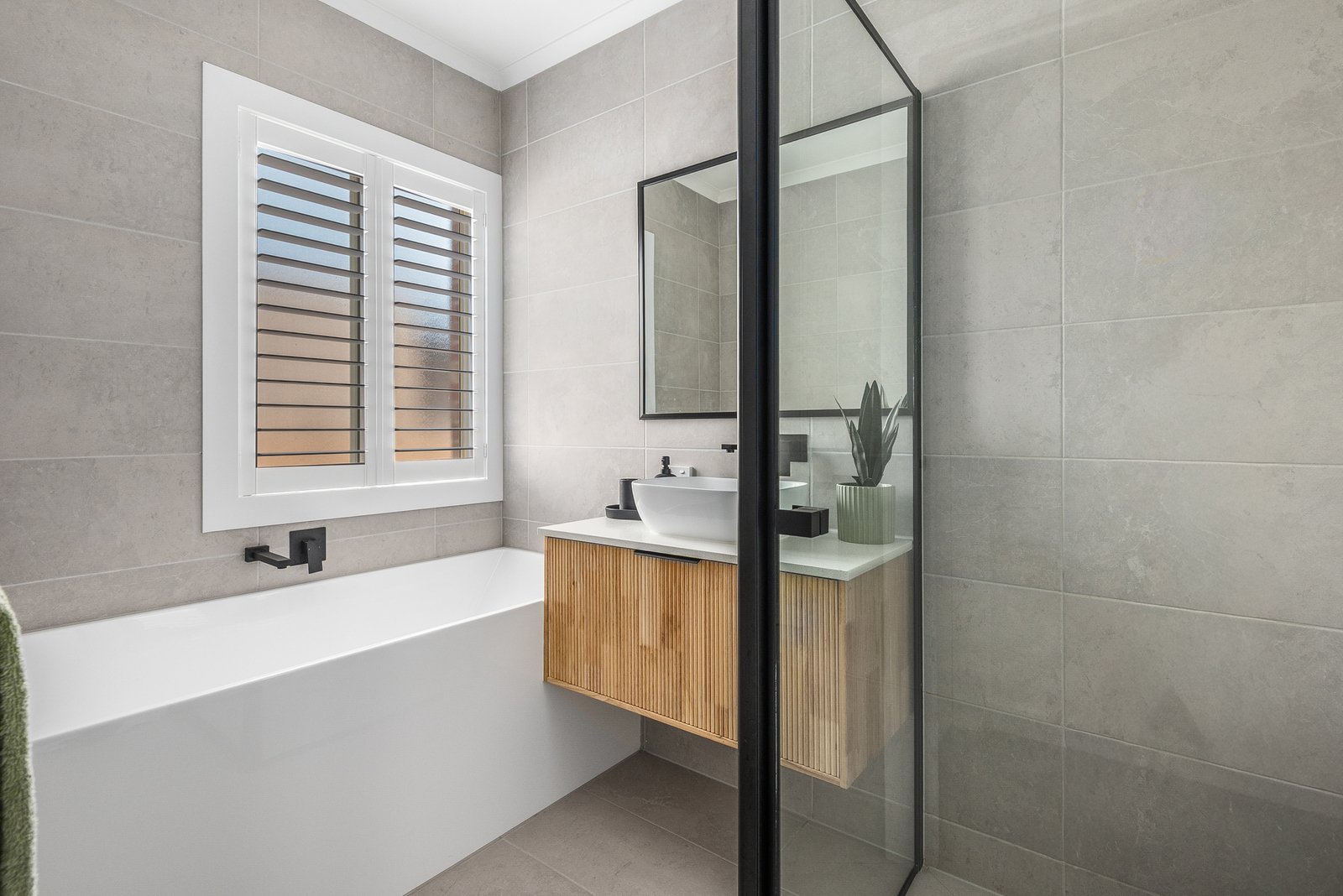 The main bedroom is a privately zoned retreat with picturesque views, walk-in robes and a tastefully presented ensuite finished in floor-to-ceiling tiles, with double stone-topped vanity, chic tapware and classic plantation shutters. Two additional bedrooms are positioned in a rear wing, both include built-in robes, serviced by a stylish main bathroom with luxurious bath, separate shower, floating vanity, and a separate wc.